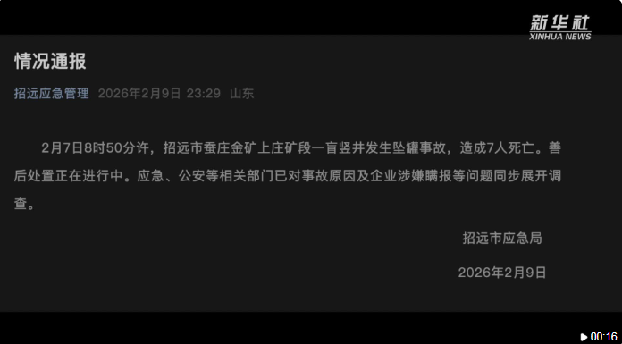 据山东烟台招远市应急管理局9日通报,2月7日8时50分许,招远市蚕庄金矿上庄矿段一盲竖井发生坠罐事故,造成7人死亡。善后处置正在进行中。应急、公安等相关部门已对事故原因及企业涉嫌瞒报等问题同步展开调查。