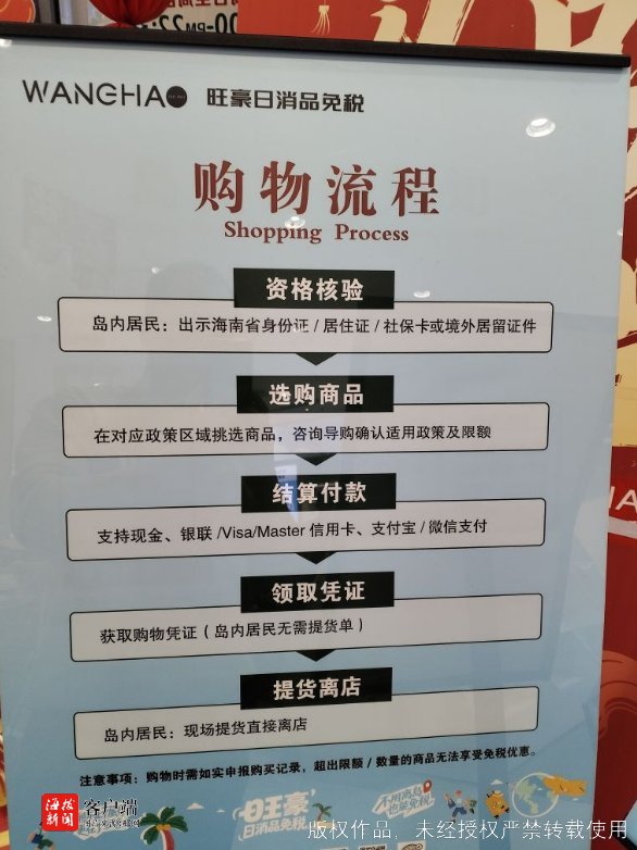 为了让消费者能够顺利、便捷地享受免税购物服务,店内设置清晰的“温馨提示”“使用限制”“购物流程”指引。