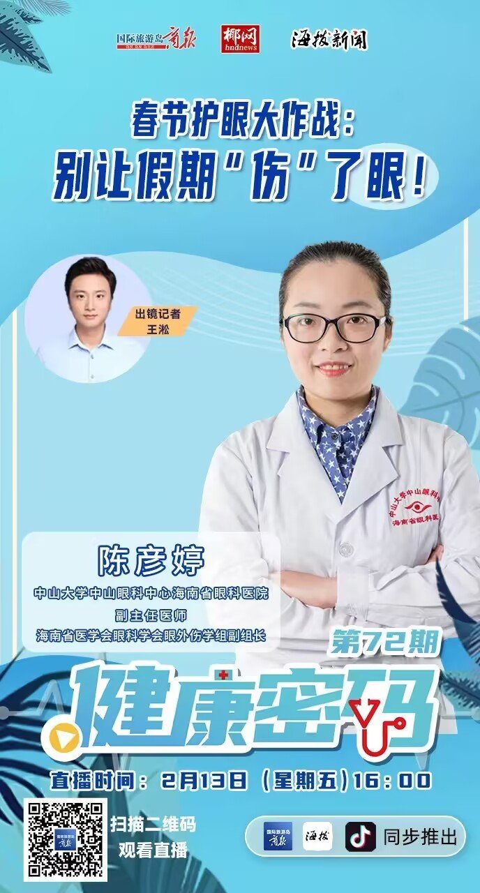 为了让大家能过一个既开心又明亮的健康年,2月13日16时,国际旅游岛商报第72期《健康密码》特别策划“春节护眼大作战”,并荣幸邀请省内顶尖眼科机构——中山大学中山眼科中心海南省眼科医院副主任医师、海南省医学会眼科学会眼外伤学组副组长陈彦婷医生回答有关用眼卫生问题。
