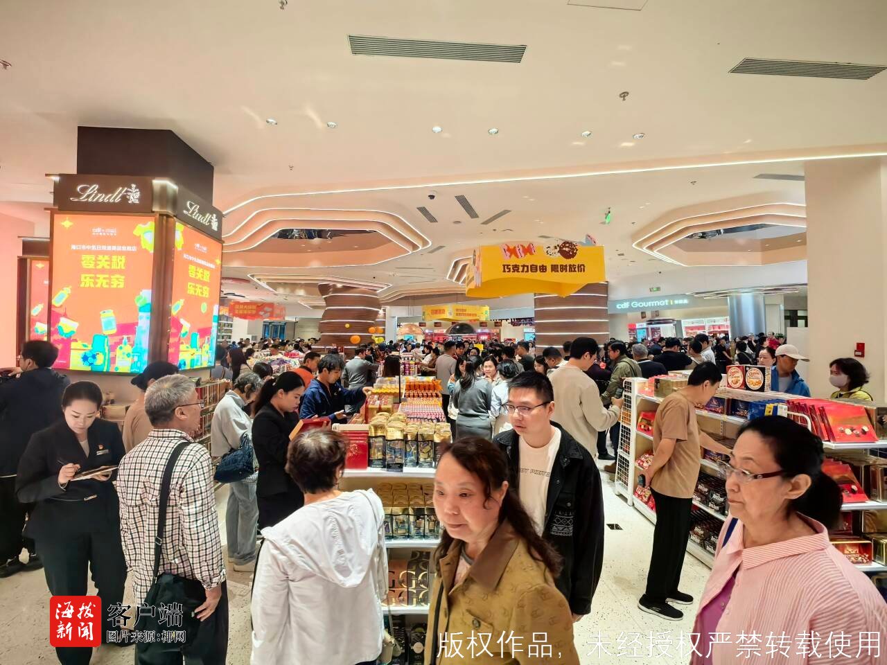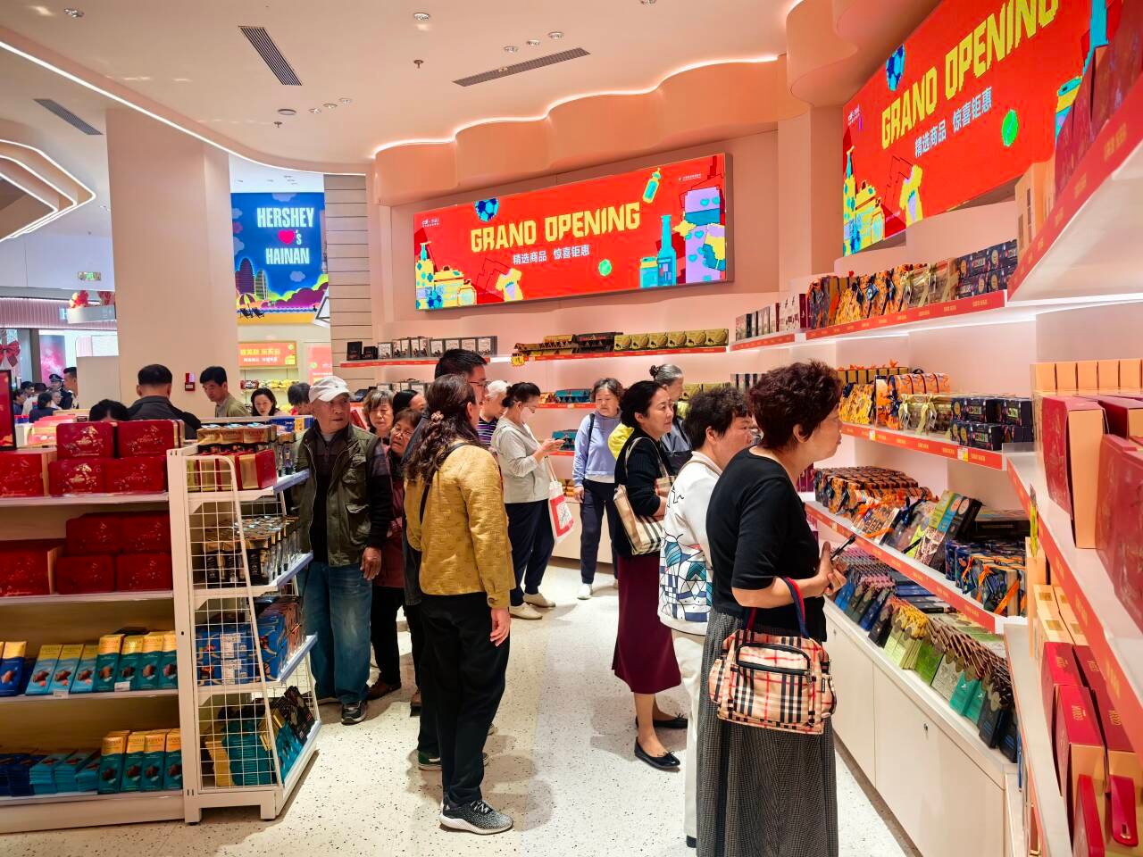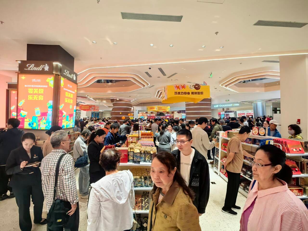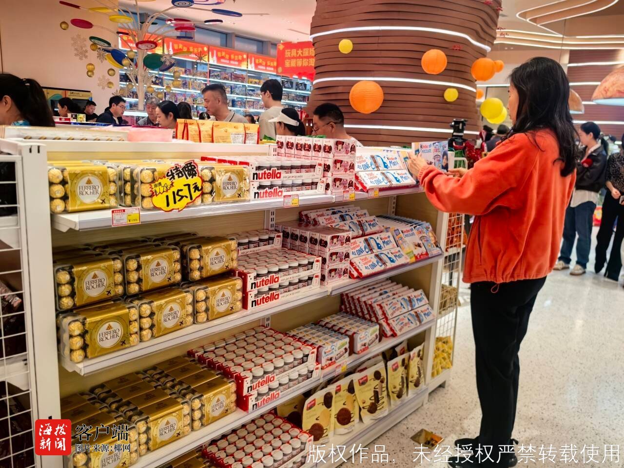 “这个五折巧克力也太棒了!每一罐巧克力不仅有五折优惠,同时购买两罐还可以有礼盒袋子赠送,非常适合当作过年手办礼‘走亲朋好友’,包装也喜庆!”刘女士一边选购一边开心地与记者分享到,今天刘女士是恰逢路过店铺,得知这里很多商品不仅可以享受“零关税”,而且折扣也很香,所以毫不犹豫地也排队进场购物。