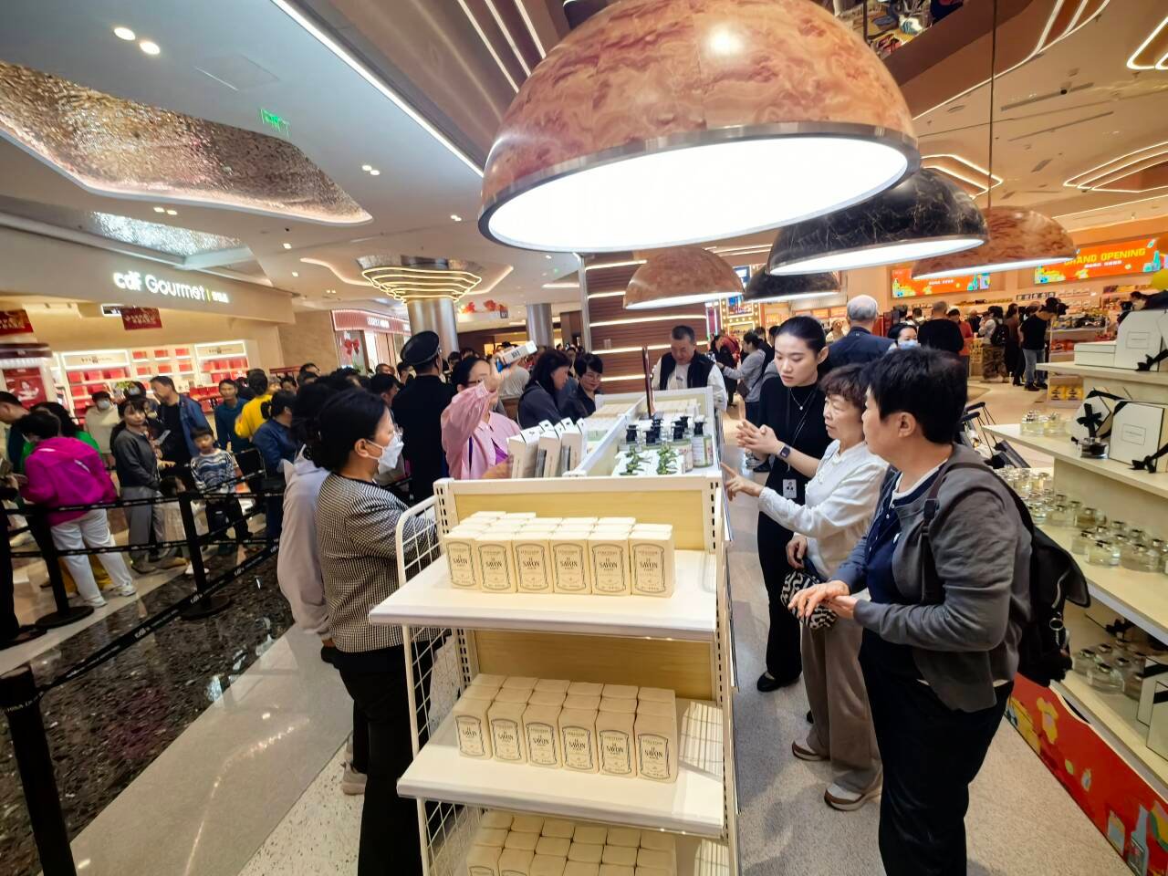 当天,现场热闹非凡,消费者们络绎不绝地排队选购心仪商品。琳琅满目的多款巧克力、各式各样的乐高积木和玩具品类、生活居民生活品的洗发水、沐浴露、染发膏,还有香水、护肤品套盒、多款品牌奶粉、“精致”生活的陶瓷玻璃杯具等等,店内产品丰富多样,消费者们选购的更是不亦乐乎。