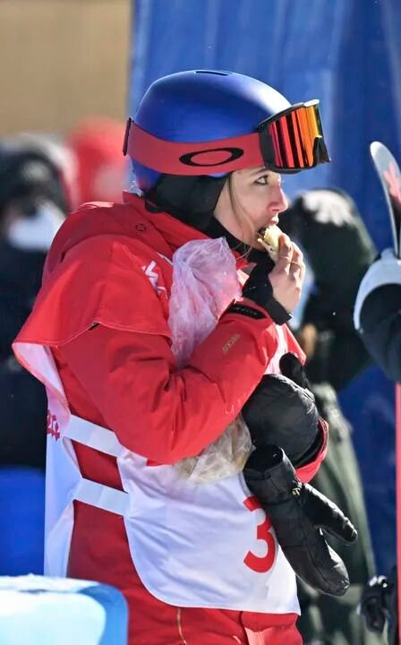 △在北京2022年冬奥会自由式滑雪女子坡面障碍技巧资格赛中,中国选手谷爱凌在等待裁判打分时吃韭菜盒子。新华社记者 郭程 摄