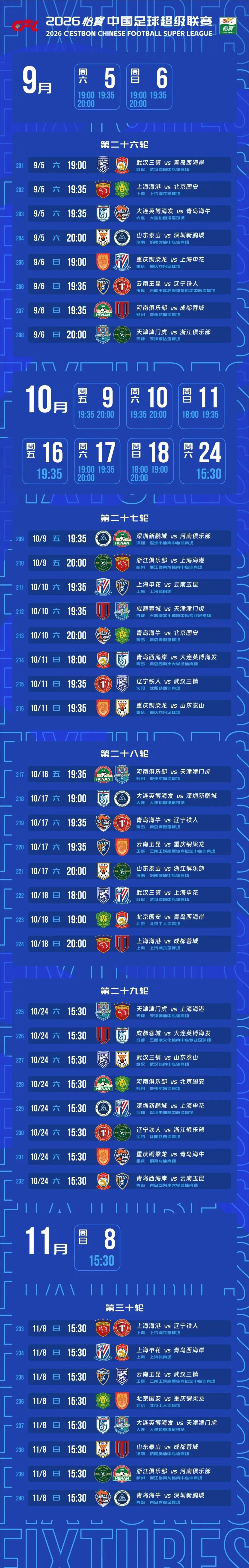 2026中超联赛赛程发布,3月6日开幕