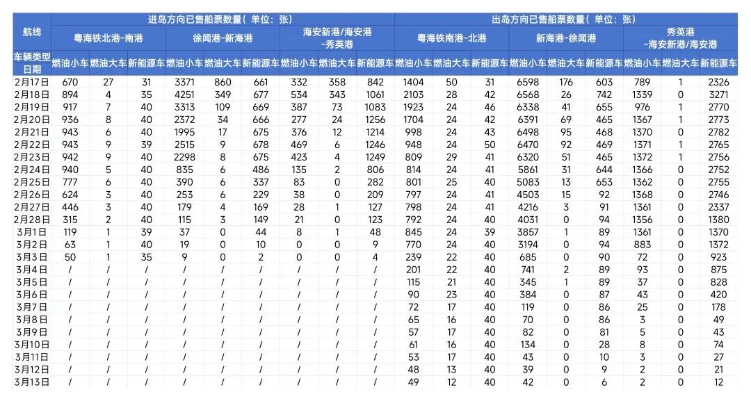 2月16日,琼州海峡客滚运输共发送航班183班次,运输旅客70930人次、车辆17608辆次。