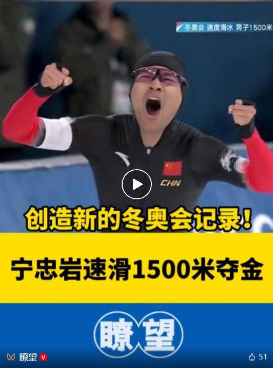 第三金!宁忠岩1500米速滑破奥运纪录夺冠