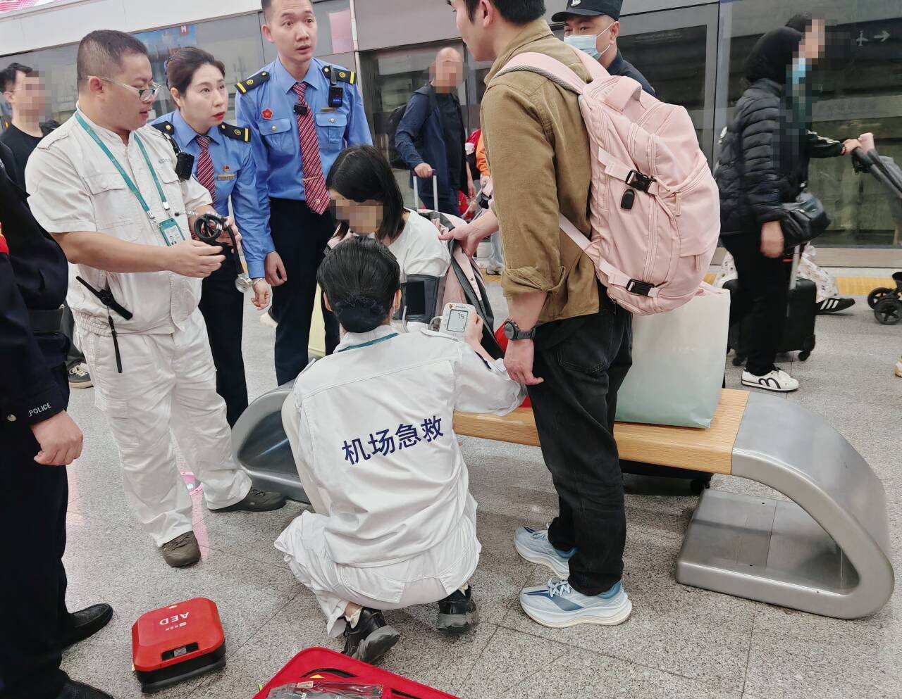 接到通知后,客运值班员廖琴琴第一时间拨打120急救电话;与此同时,值班员李镇同步拨通机场急救电话。值班站长段丹与车站派出所民警闻讯而动,立即携带轮椅赶到指定的站台门处,提前做好接车准备,确保救援通道畅通无阻。