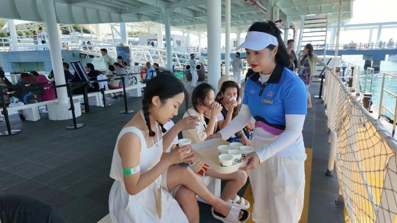在码头、潜水大厅等游客聚集区域,暖心服务台整齐摆放着饮用水、能量小食与应急用品,免费供游客随时取用。景区还设置了专门的老年人休息区,配备了外籍和双语服务人员,并完善了多语种标识,力求让每一位游客都能感受到宾至如归的关怀。
