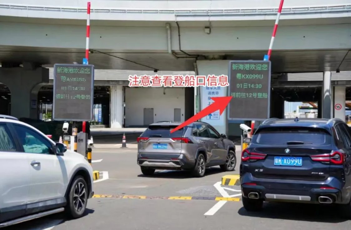 新海港过海的小车可导航至“长滨北路”。设在长滨北五路和海色路的交叉口的查验点由自动设备对进港的车辆是否已提前购票、是否已经到了规定进港时间进行严格识别,早到超过2小时进不了港。