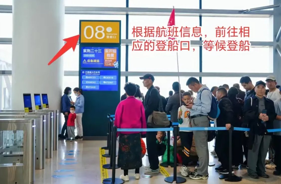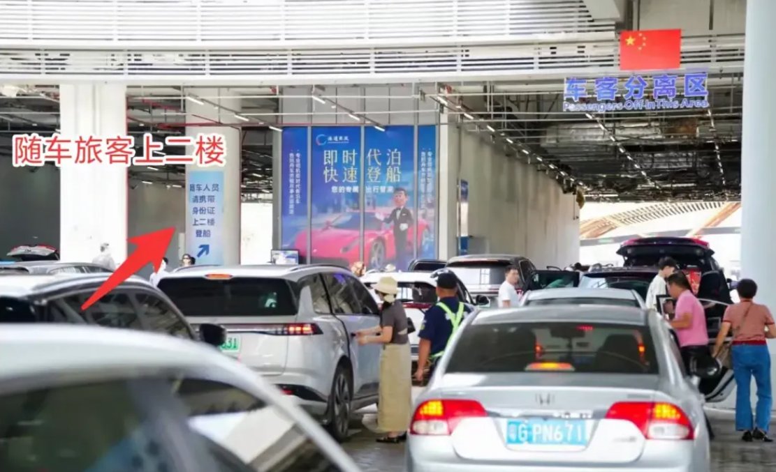 经查验设备识别成功后,车辆沿进港通道驶向港区。随车旅客与司机在枢纽一层车客分离区完成人车分离流程,乘坐扶梯上二层,经公安查验及安检通过后,前往相应的登船口,等待检票登船。