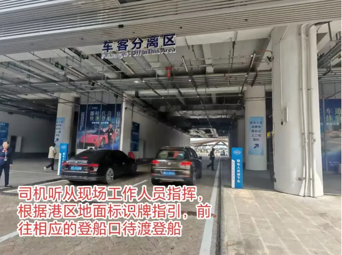 司机则需驾车完成安全检查后,接受公安查验;请留意LED屏或短信通知确认登船信息,依照引导标识驾车前往对应登船口待渡区,等候登船。
