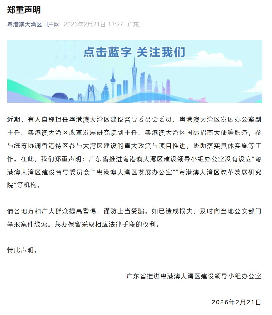 2月21日,广东省推进粤港澳大湾区建设领导小组办公室在“粤港澳大湾区门户网”微信公众号发布声明,打假“粤港澳大湾区建设督导委员会”等机构,提醒大众谨防受骗。