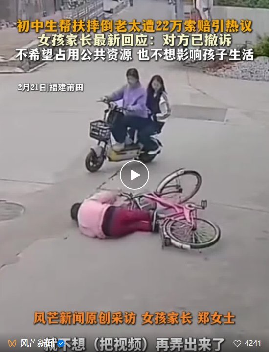 (原标题:“初中女生扶老人遭索赔22万元”,原告方已撤诉)
