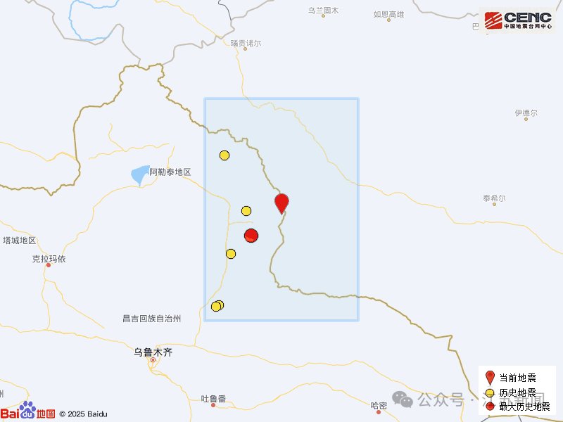 历史地震:根据中国地震台网速报目录,震中周边200公里内近5年来发生3级以上地震共7次,最大地震是本次地震,历史地震分布如图。