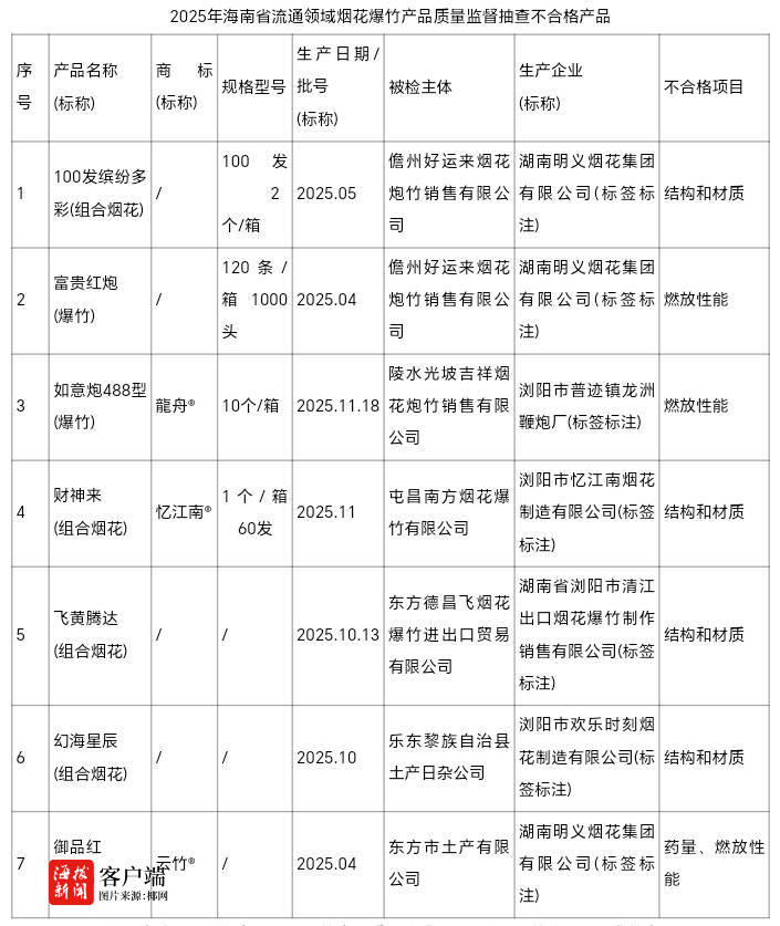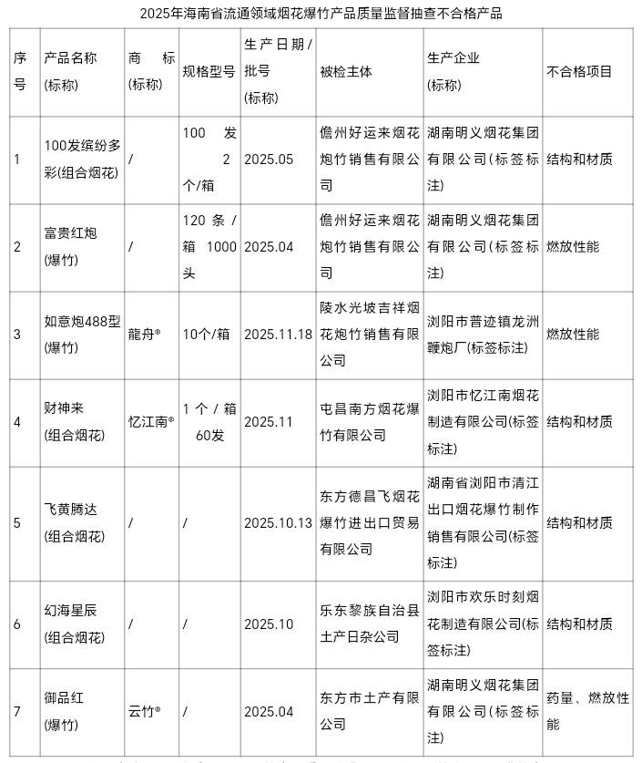 据介绍,7批次不合格产品是100发缤纷多彩(组合烟花)、富贵红炮(爆竹)、如意炮488型(爆竹)、财神来(组合烟花)、飞黄腾达(组合烟花)、幻海星辰(组合烟花)、御品红(爆竹),分别由儋州好运来烟花炮竹销售有限公司(2批次)、陵水光坡吉祥烟花炮竹销售有限公司、屯昌南方烟花爆竹有限公司、东方德昌飞烟花爆竹进出口贸易有限公司、乐东黎族自治县土产日杂公司、东方市土产有限公司销售,分别由湖南明义烟花集团有限公司(3批次)、浏阳市普迹镇龙洲鞭炮厂、浏阳市忆江南烟花制造有限公司、湖南省浏阳市清江出口烟花爆竹制作销售有限公司、浏阳市欢乐时刻烟花制造有限公司生产,涉及的不合格项目为药量、燃放性能(计量误差)、结构和材质。