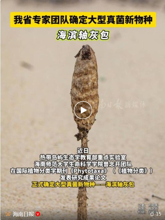 近日,热带岛屿生态学教育部重点实验室、海南师范大学生命科学学院曾念开团队,在国际植物分类学期刊《Phytotaxa》(《植物分类》)发表研究成果论文,正式确认大型真菌新物种——海滨轴灰包。