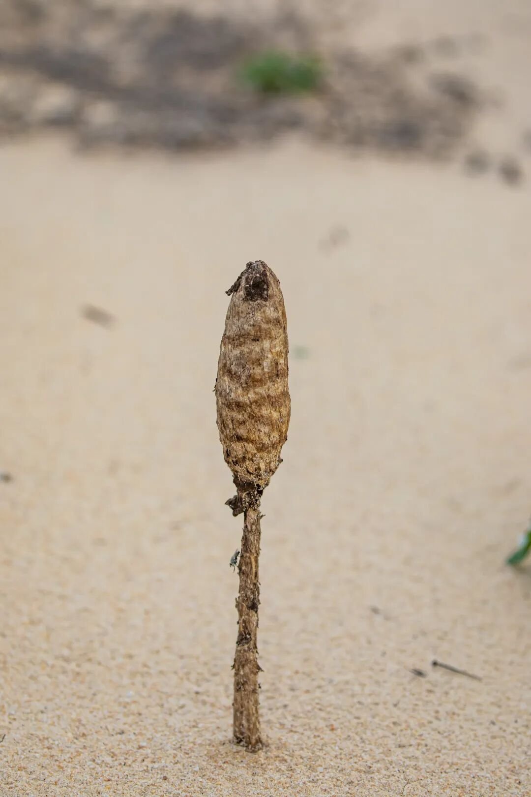 与常见伞状展开的蘑菇不同,海滨轴灰包的伞面呈闭合状态。这种被称为“腹菌”的子实体形态,被推测是适应极端环境的重要演化特征。该物种高度可达23厘米,包被呈浅棕至深褐色,表面覆有毛状或鳞片状结构。成熟后,包被开裂或脱落,散播出大量孢子粉,且会随风传播。其担孢子壁厚达2至3微米,个头明显大于其他同类真菌。