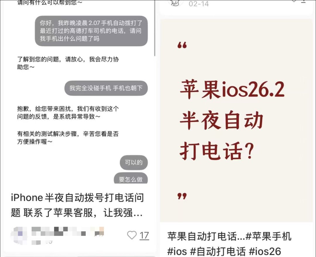 记者查询发现,2025年11月就有多名用户在社交平台反映,更新iPhone手机至iOS 26.0.1版本后,手机在锁屏状态下半夜自动拨打电话给陌生人,被呼叫对象包括快递员、商家客服等。部分未更新至最新系统的老款iPhone也出现了类似问题。
