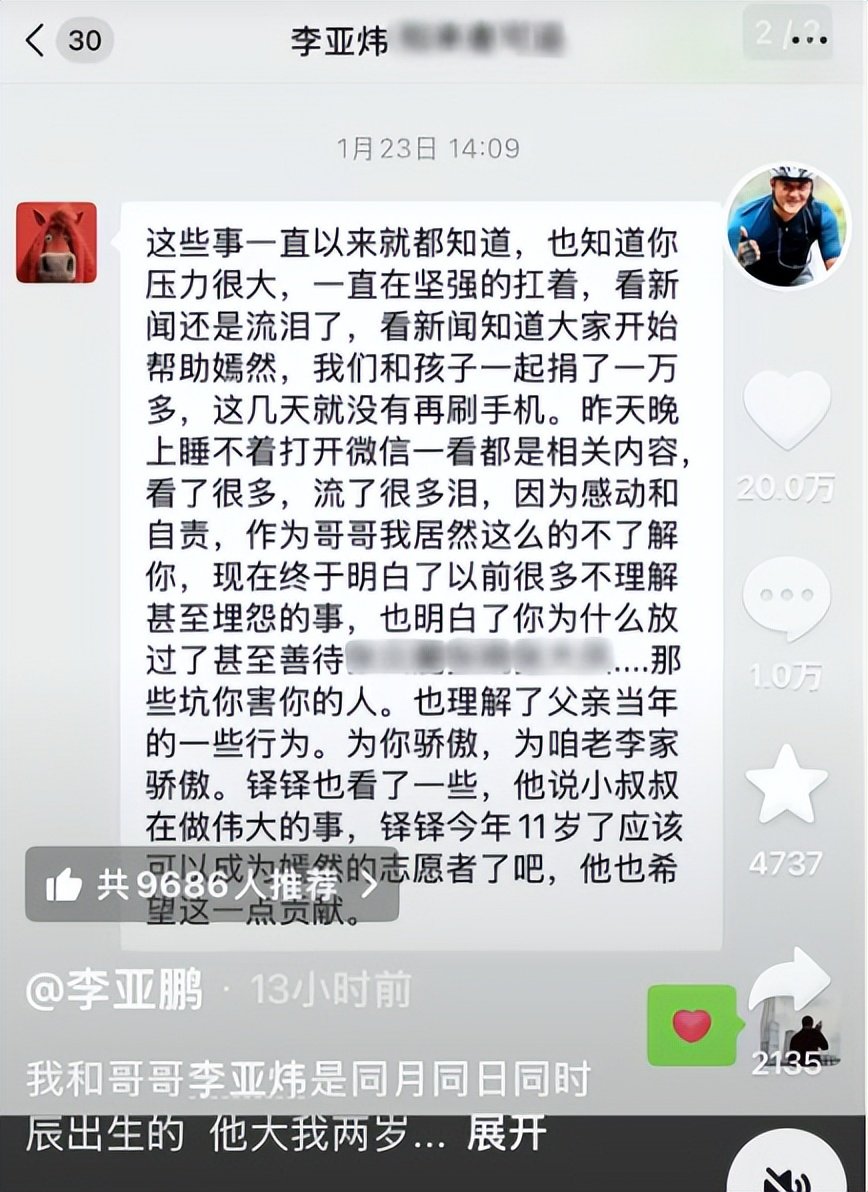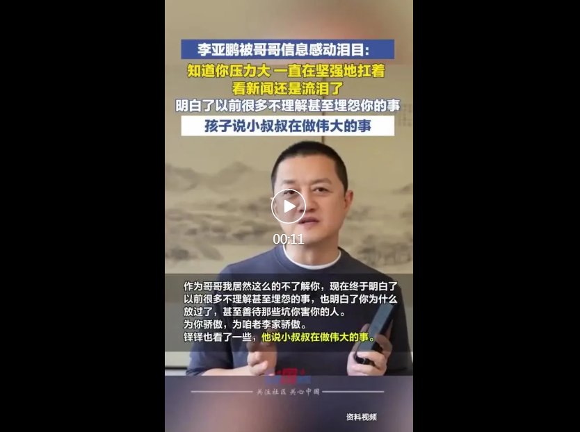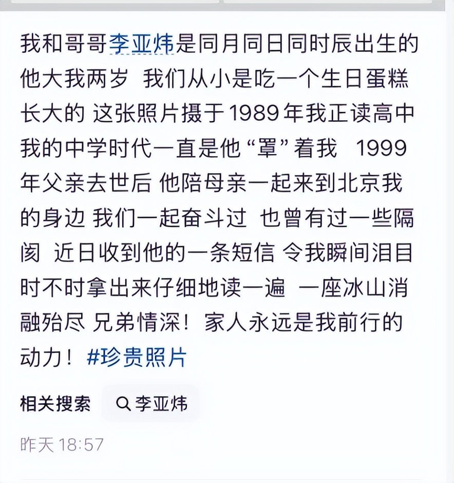 2月26日,李亚鹏发文被哥哥信息感动泪目: