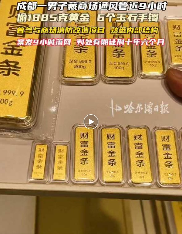 (原标题:男子藏身于商场通风管道内潜伏近9小时,盗走黄金首饰1885.421克、玉石手镯6个等,总价值达140万余元,案发后仅9小时被抓获)