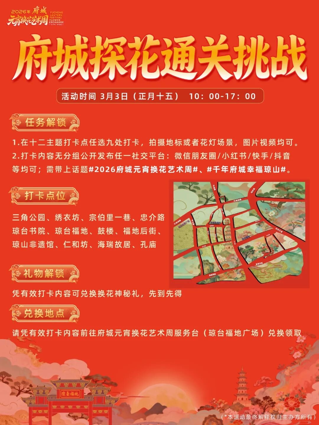 内容:十二大网红打卡点,任选九处合影留念即可解锁府城元宵限定乐趣(数量有限,先到先得)。