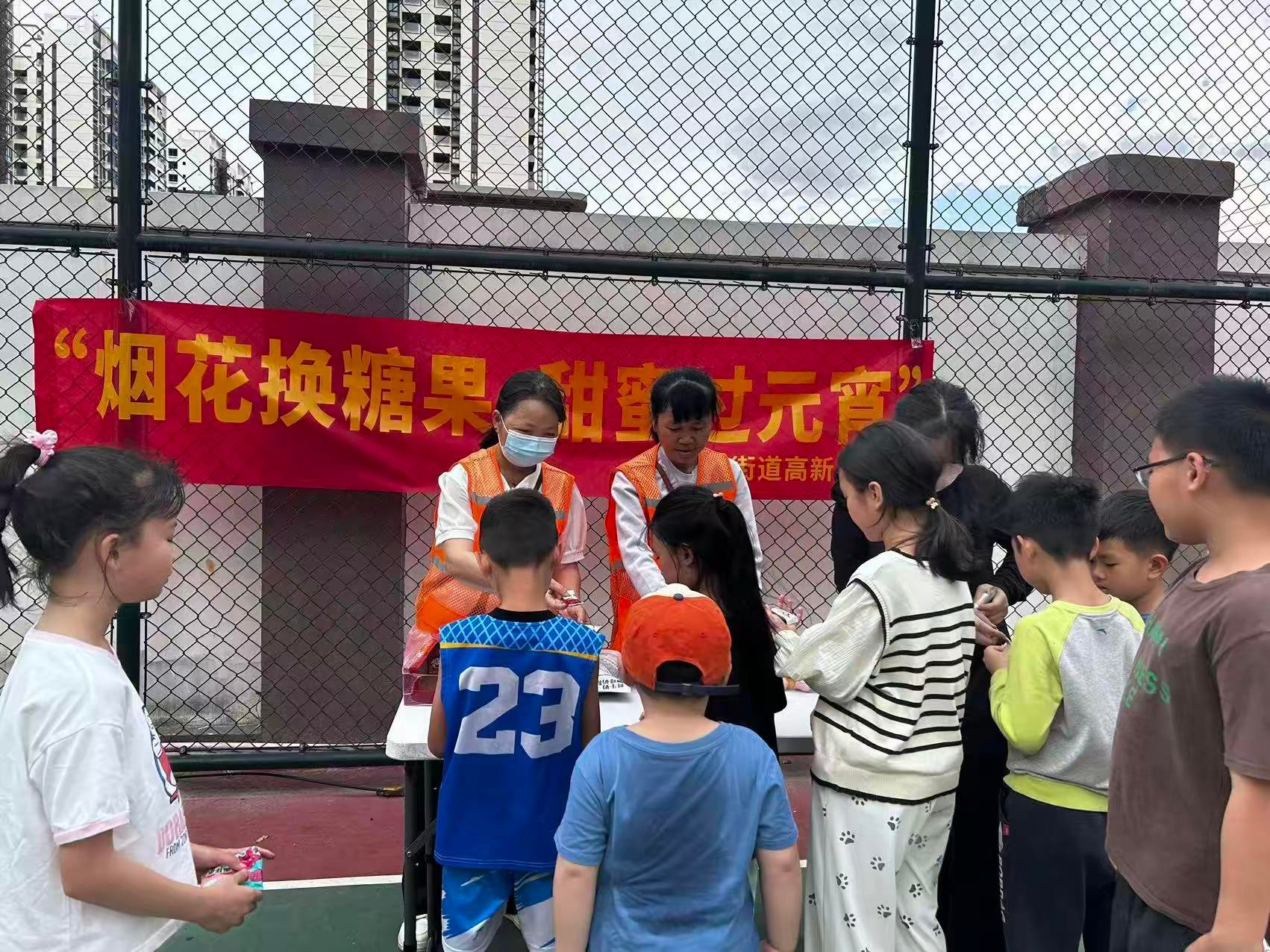 此次活动分别在凤凰雅居小区、宝源花园小区、望海金豪小区和书场村等7处点位同步开展,秀英街道提前在各点位设置了信息登记区、礼品兑换区,配齐消防器材,安排专人全程值守,为前来参与“烟花换糖果”活动的居民提供全流程贴心服务。