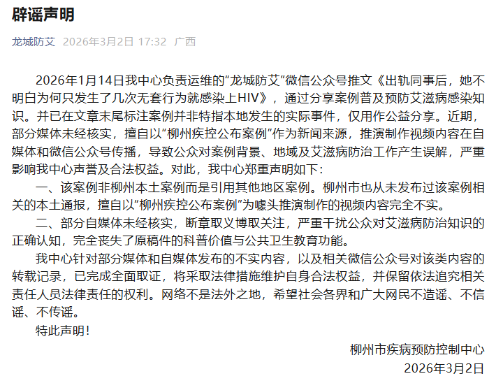 2026年1月14日我中心负责运维的“龙城防艾”微信公众号推文《出轨同事后,她不明白为何只发生了几次无套行为就感染上HIV》,通过分享案例普及预防艾滋病感染知识。并已在文章末尾标注案例并非特指本地发生的实际事件,仅用作公益分享。近期,部分媒体未经核实,擅自以“柳州疾控公布案例”作为新闻来源,推演制作视频内容在自媒体和微信公众号传播,导致公众对案例背景、地域及艾滋病防治工作产生误解,严重影响我中心声誉及合法权益。对此,我中心郑重声明如下: