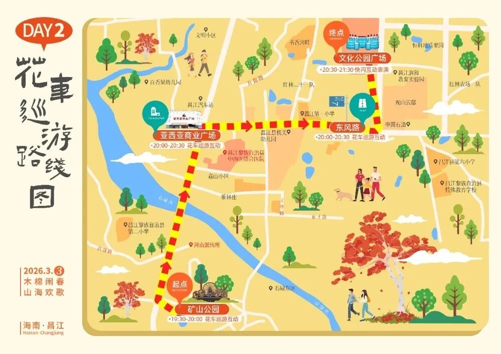 明星助阵文艺汇演:3月3日18:00—22:00,金山文化公园邀请海南著名歌手吴晓芸、琼剧演员王琴登台,经典琼剧、海南八音非遗展演、腰鼓、拉丁等节目轮番上演。