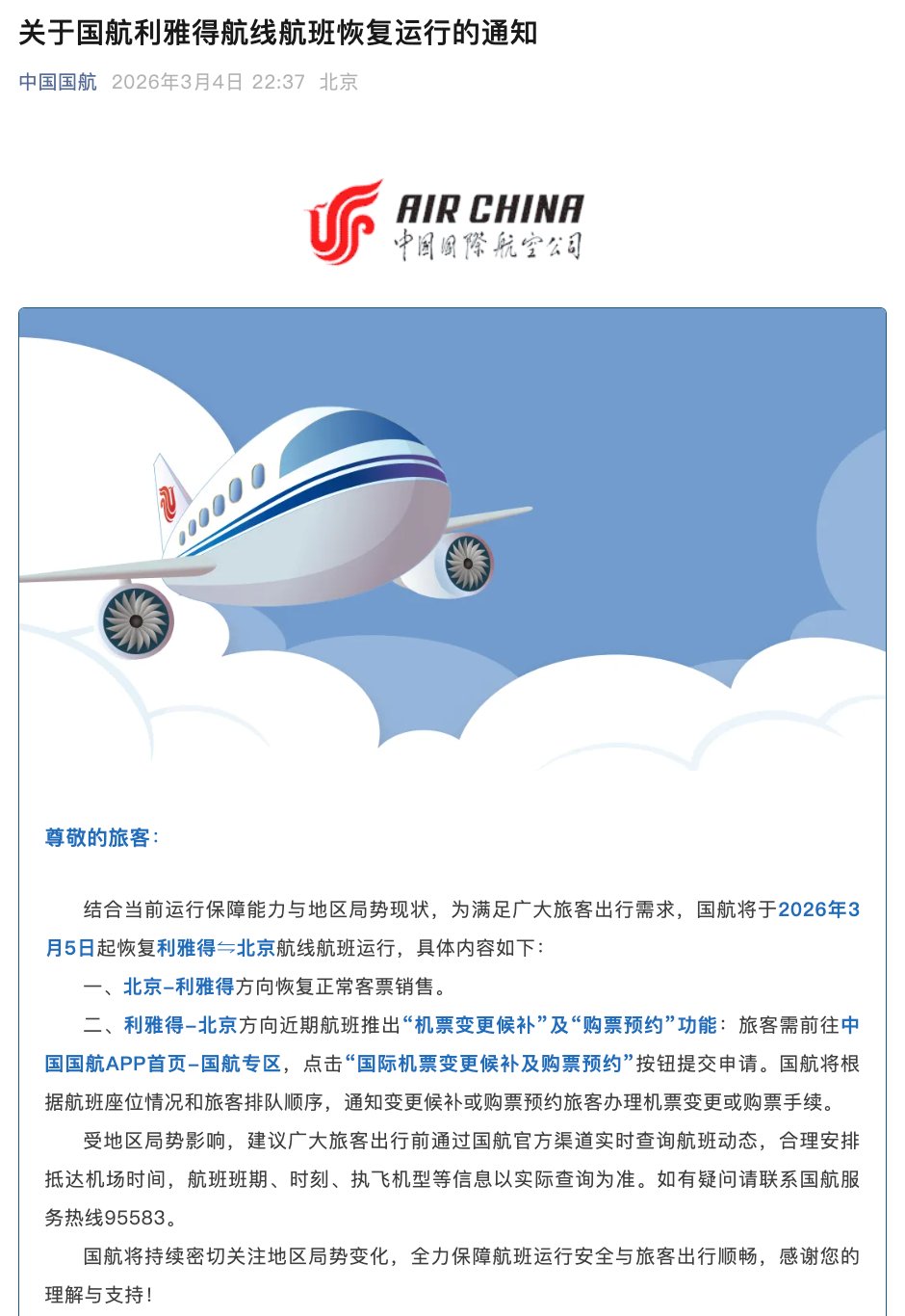 3月4日,中国国航发布“关于国航利雅得航线航班恢复运行的通知”。