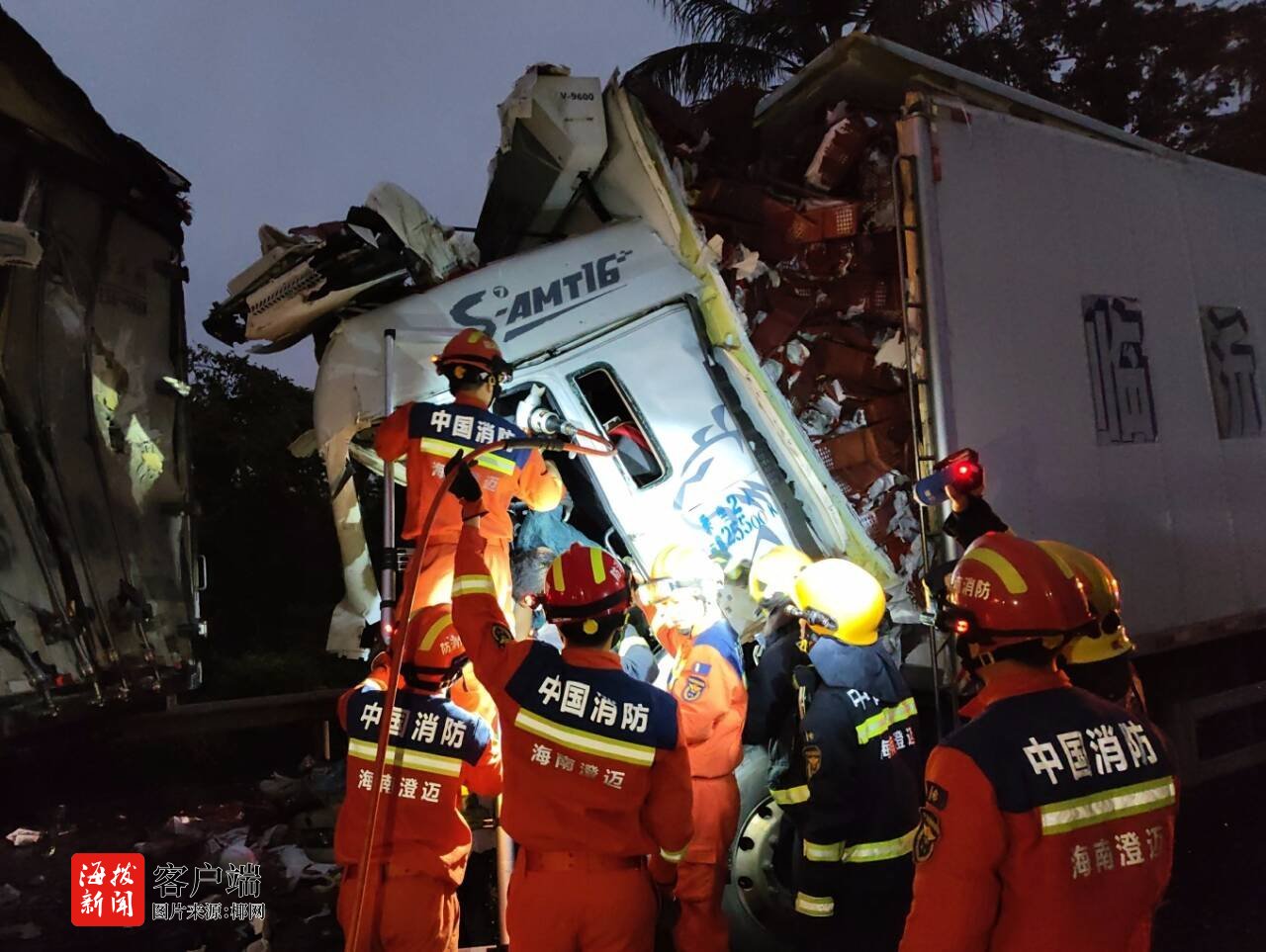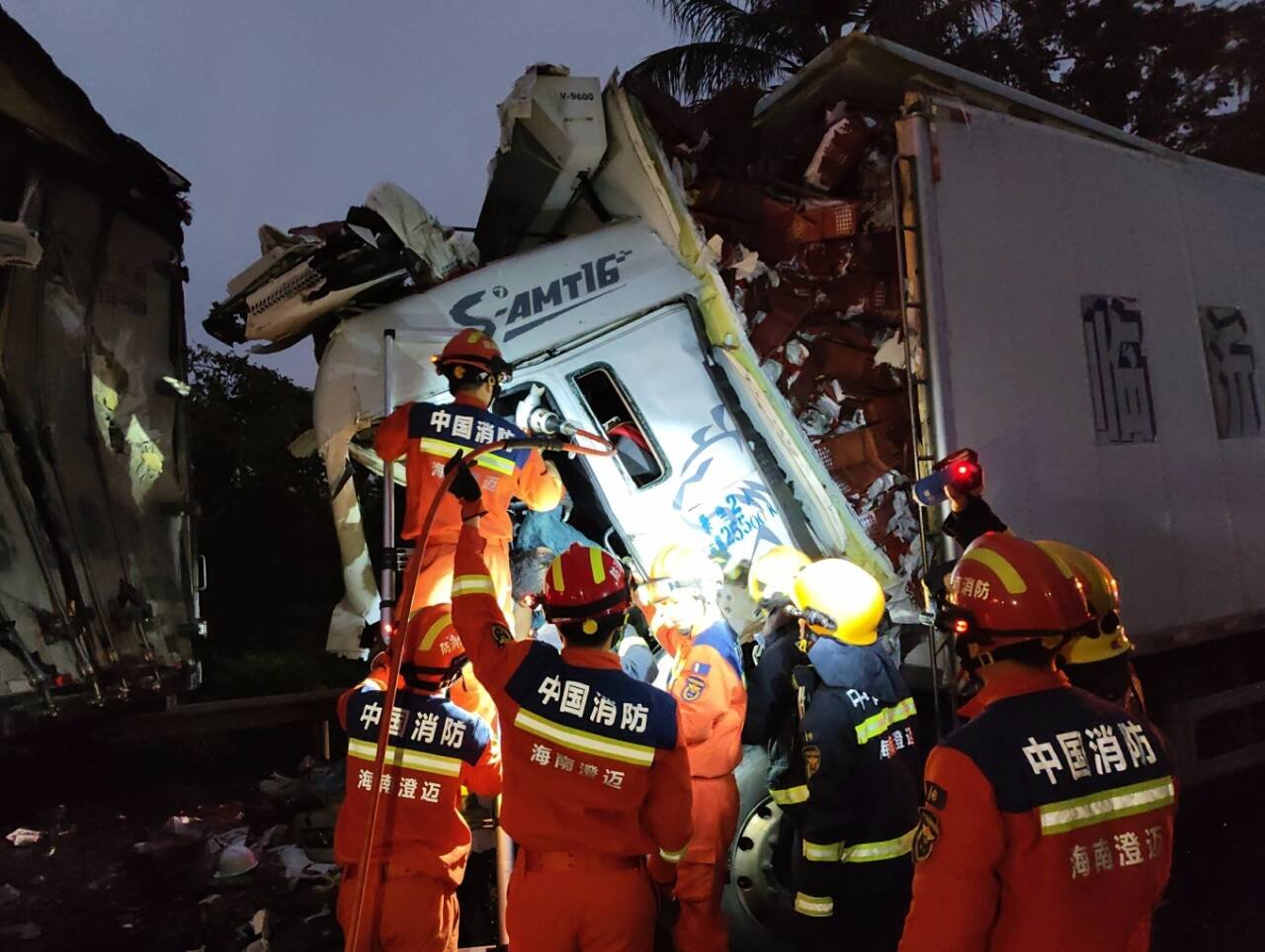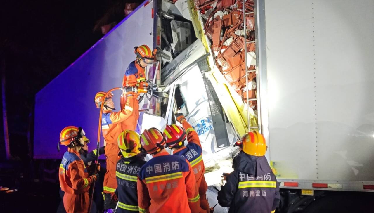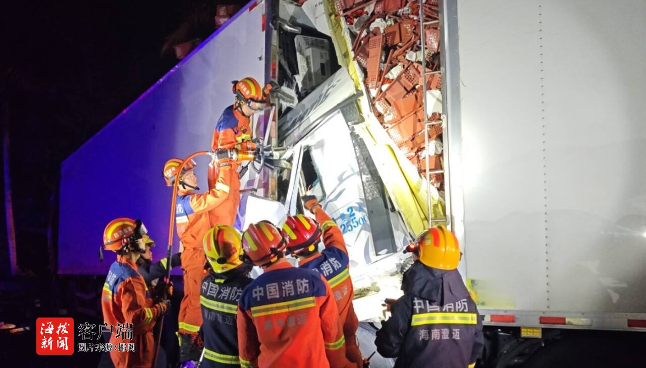三辆重型货车发生连环追尾致两人被困,澄迈消防紧急救援