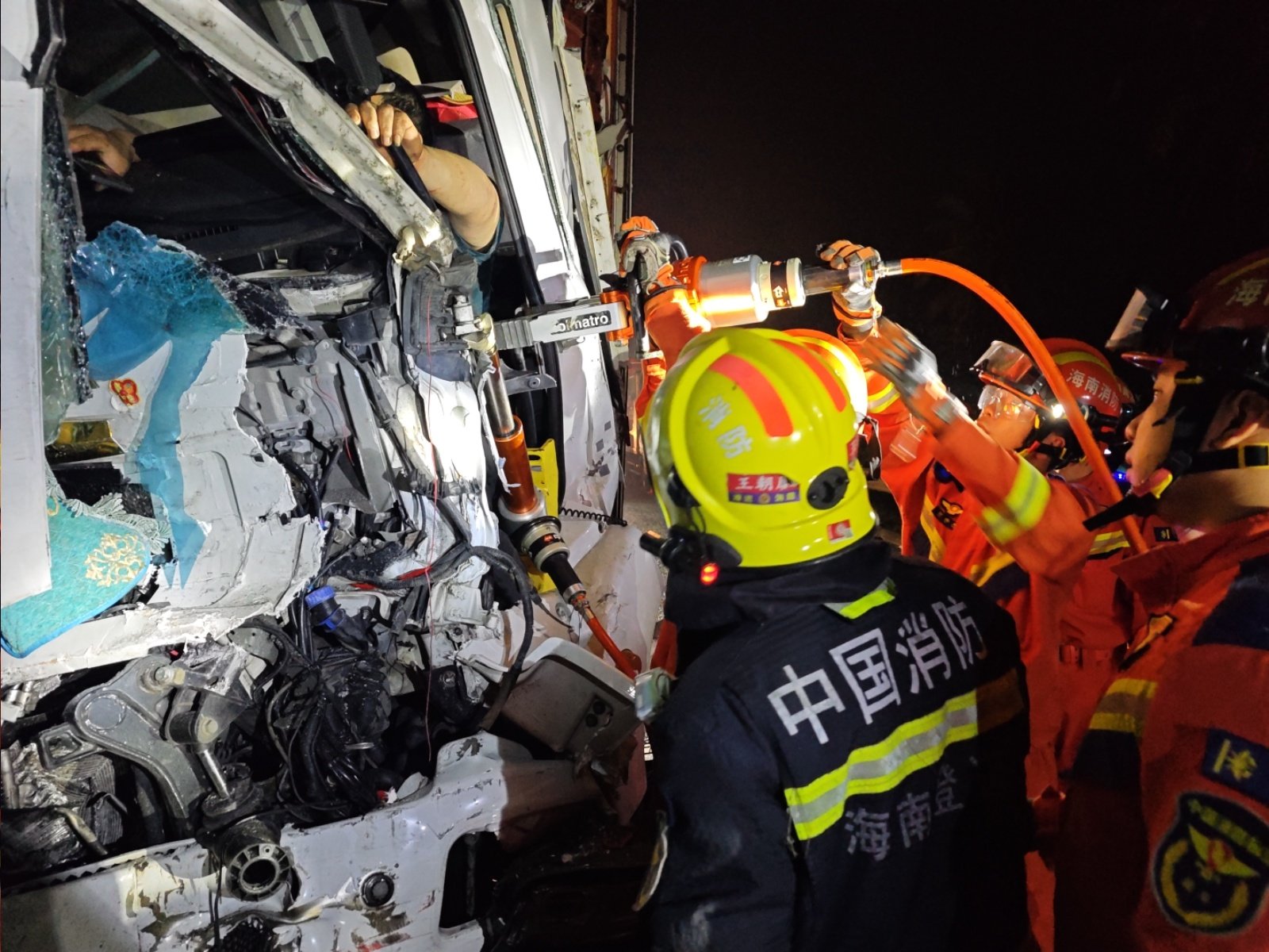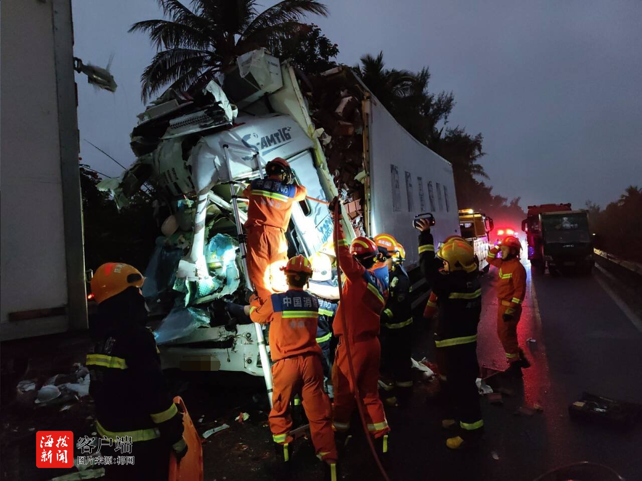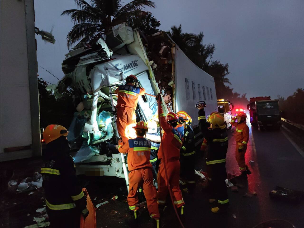 三辆重型货车发生连环追尾致两人被困,澄迈消防紧急救援