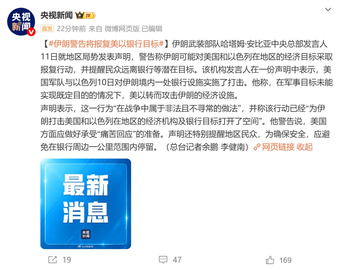 伊朗武装部队哈塔姆·安比亚中央总部发言人11日就地区局势发表声明,警告称伊朗可能对美国和以色列在地区的经济目标采取报复行动,并提醒民众远离银行等潜在目标。该机构发言人在一份声明中表示,美国军队与以色列10日对伊朗境内一处银行设施实施了打击。他称,在军事目标未能实现既定目的的情况下,美以转而攻击伊朗的经济设施。