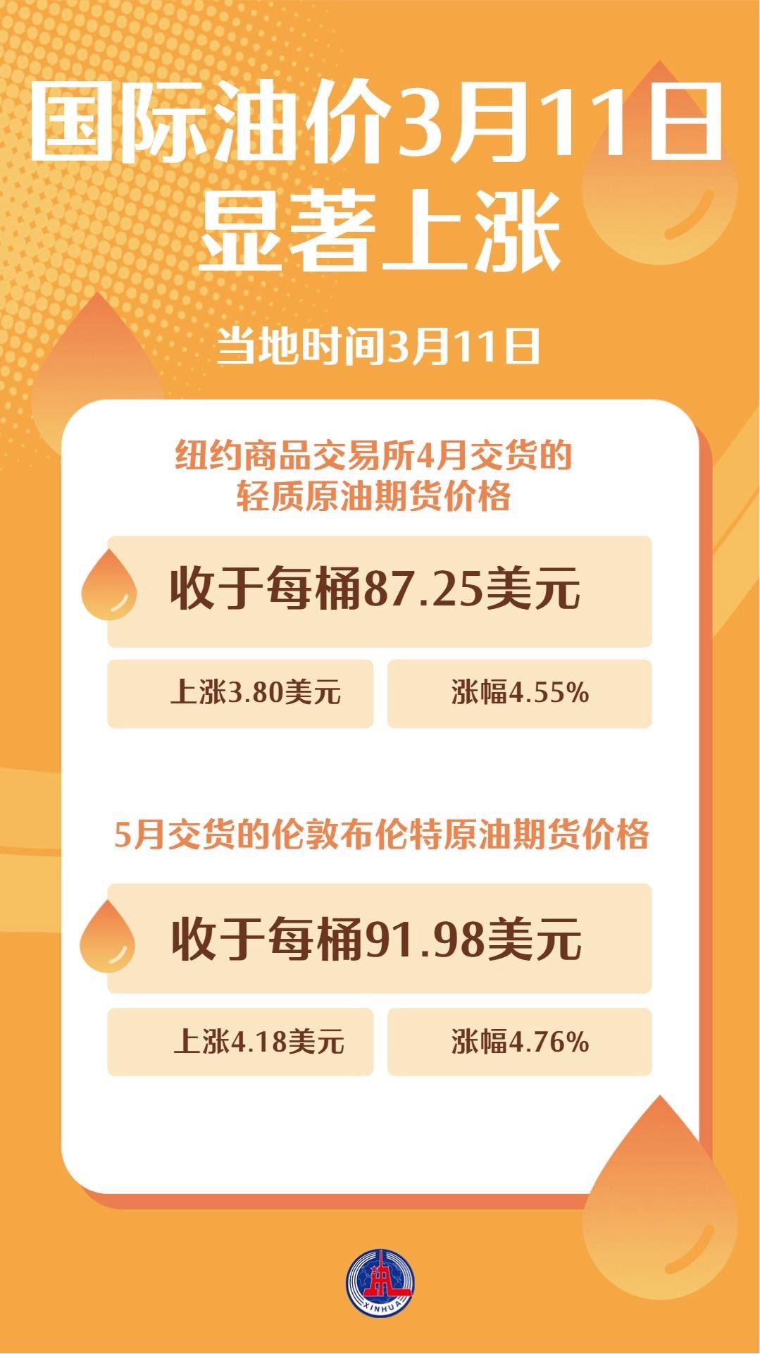 新华社纽约3月11日电 国际油价11日显著上涨。