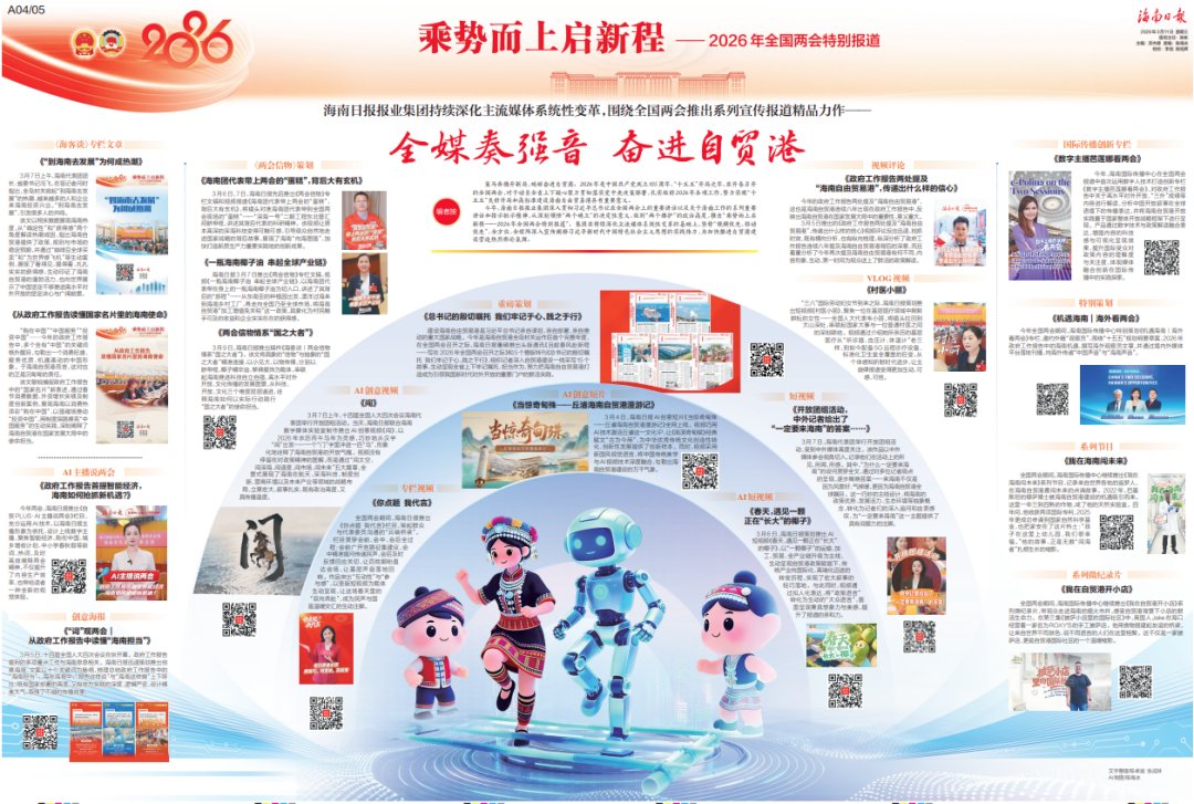 今年,海南日报报业集团深入贯彻习近平总书记在全国两会上的重要讲话以及关于海南工作的系列重要讲话和指示批示精神,从深刻领悟“两个确立”的决定性意义、做到“两个维护”的政治高度,推出“乘势而上启新程——2026年全国两会特别报道”。集团在持续深化主流媒体系统性变革的基础上,坚持“视频优先、移动优先”,全方位、全矩阵深入宣传阐释习近平新时代中国特色社会主义思想的实践伟力,为加快推进自贸港建设营造热烈舆论氛围。