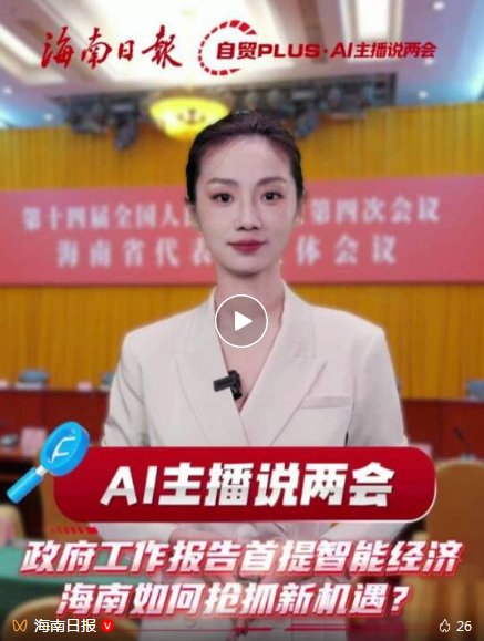 今年两会,海南日报推出《自贸PLUS·AI主播说两会》栏目,充分运用AI技术,以海南日报主播形象为依托,设计上线数字主播,聚焦智能经济、购在中国、城乡增收计划、中小学春秋假等新词、热词,及时高效阐释两会精神,不仅提升了内容生产效率,也带给读者一种全新的视觉体验。
