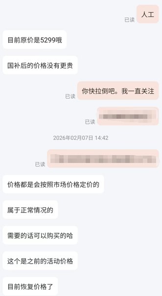 针对消费者质疑产品“国补”后涨价,客服称:“去年到今年都是有国补的,并不是才有国补的。”“每个客户都是这个价格。”但于先生则表示:“今年新一轮‘国补’,天津地区是2月6日才上线的。在此之前应该是没有的,那阵我关注到其他城市的价格更低。”