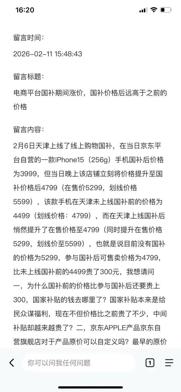 对此,于先生质疑京东自营平台销售的该款苹果手机涉嫌“先涨后补”,疑似“套取补贴”情况,于是向相关部门反映情况。