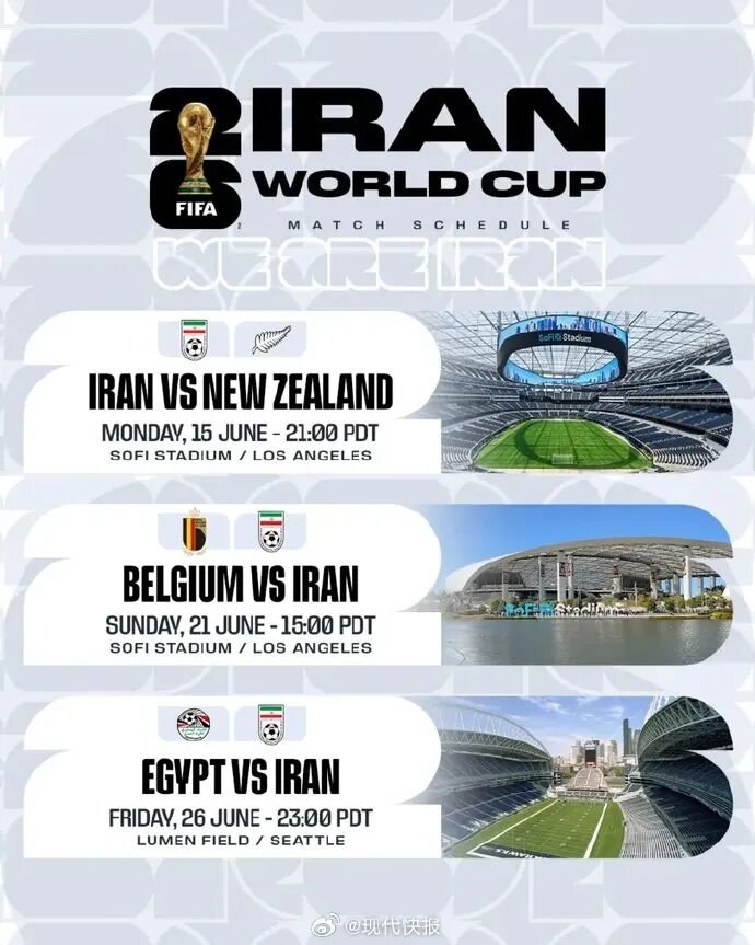 2026美加墨世界杯(美国、加拿大、墨西哥联办)将在今年6月开赛,伊朗队与比利时、埃及、新西兰同组。按此前公布的赛程计划,伊朗的三场小组赛都是在美国本土踢,两场在洛杉矶,一场在西雅图。