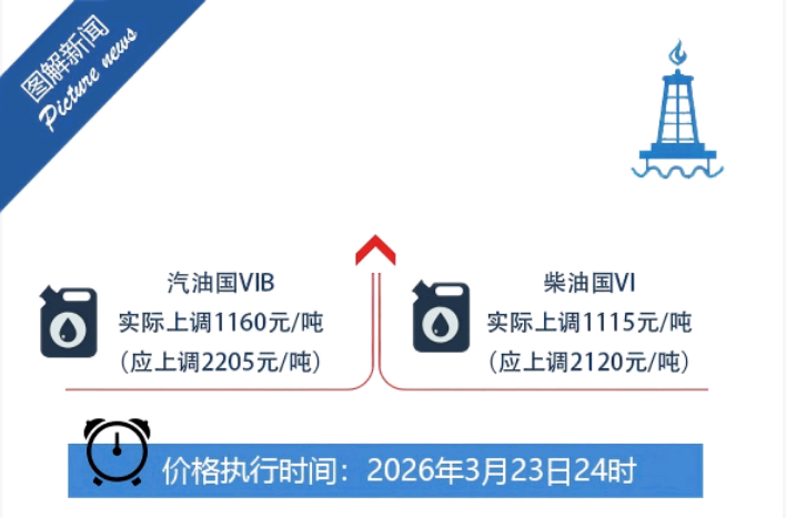 根据现行价格机制计算,自3月23日24时起,国内汽、柴油价格(标准品)每吨分别应上调2205元、2120元,调控后实际上调1160元、1115元。