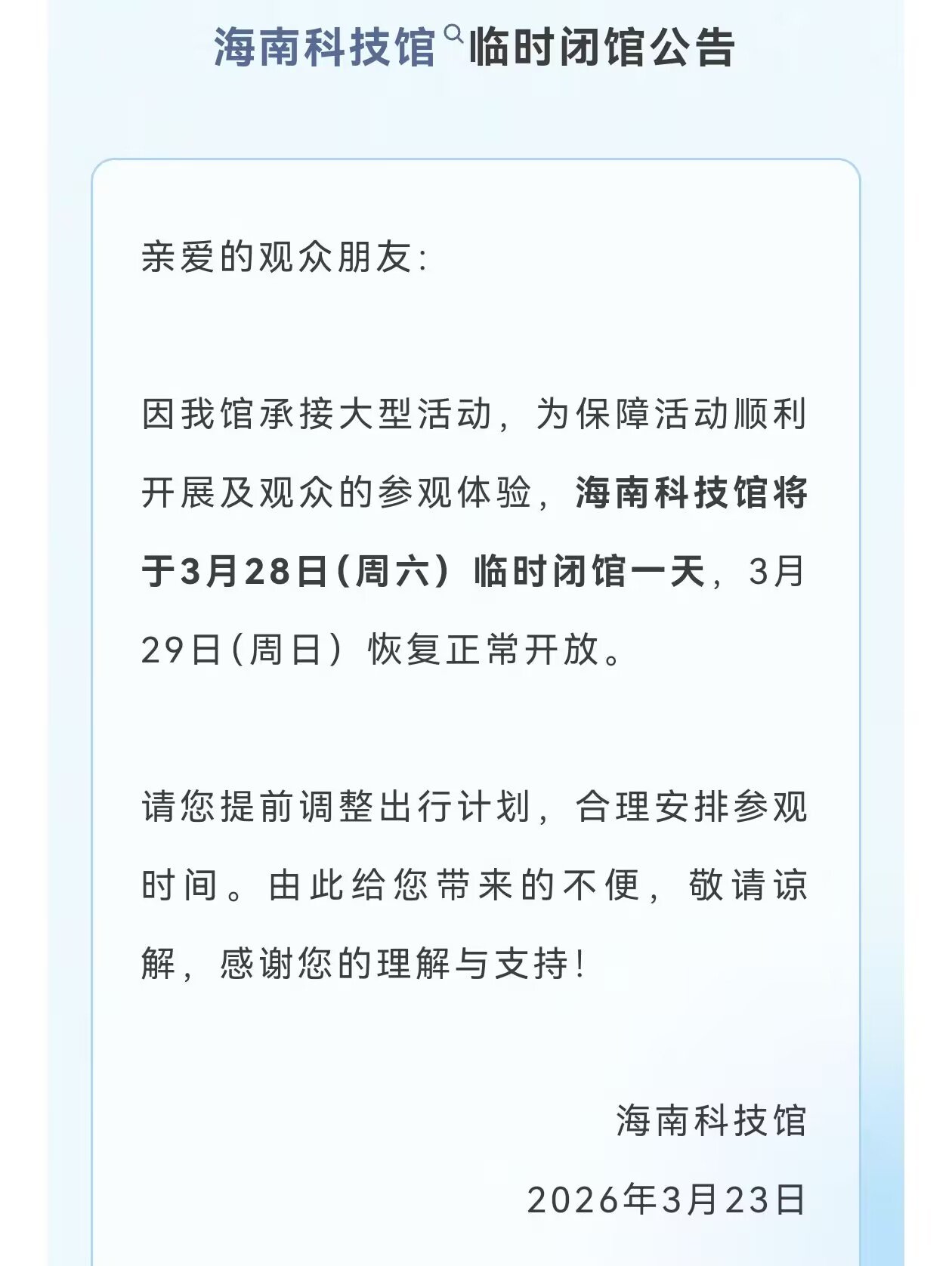 商报全媒体讯(椰网/海拔新闻记者 许文玉)3月23日,海南科技馆发布临时闭馆公告,因该馆承接大型活动,为保障活动顺利开展及观众的参观体验,海南科技馆将于3月28日临时闭馆一天,3月29日恢复正常开放。