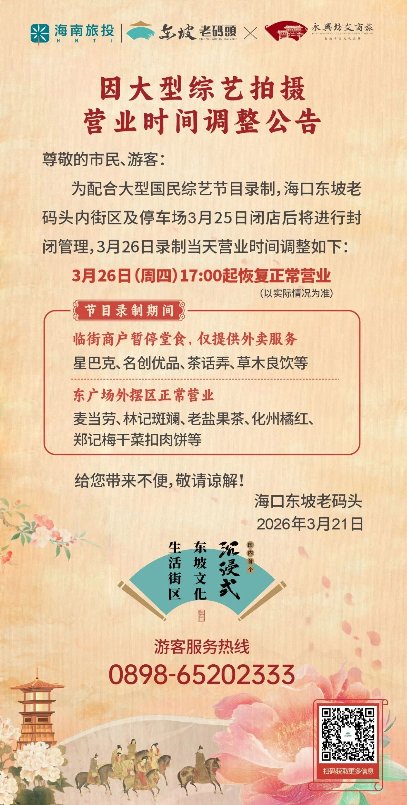 涉及大型综艺拍摄!海口东坡老码头发布营业时间调整公告