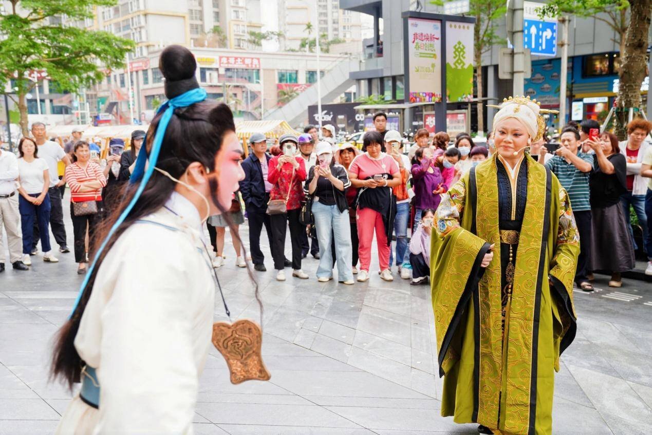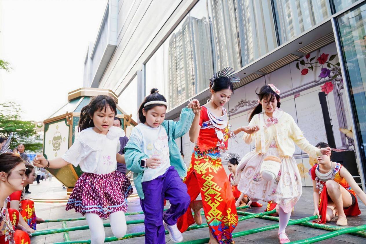 快闪表演期间,琼剧《严慈吟》吸引了众多“剧迷”提前等候,在黎族传统歌舞《打柴舞》舞者们的盛情邀请下,观众们纷纷加入其中,手拉手跳进竹竿阵,大人孩子踏着节奏跳跃穿梭,笑声与掌声交织,现场瞬间成为一片欢乐的海洋。