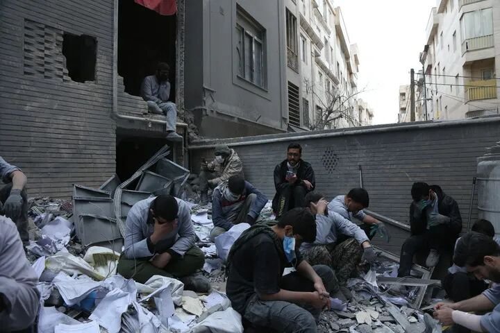 3月15日,在伊朗首都德黑兰的一处遇袭居民区,人们坐在一处建筑废墟上。新华社记者 沙达提 摄