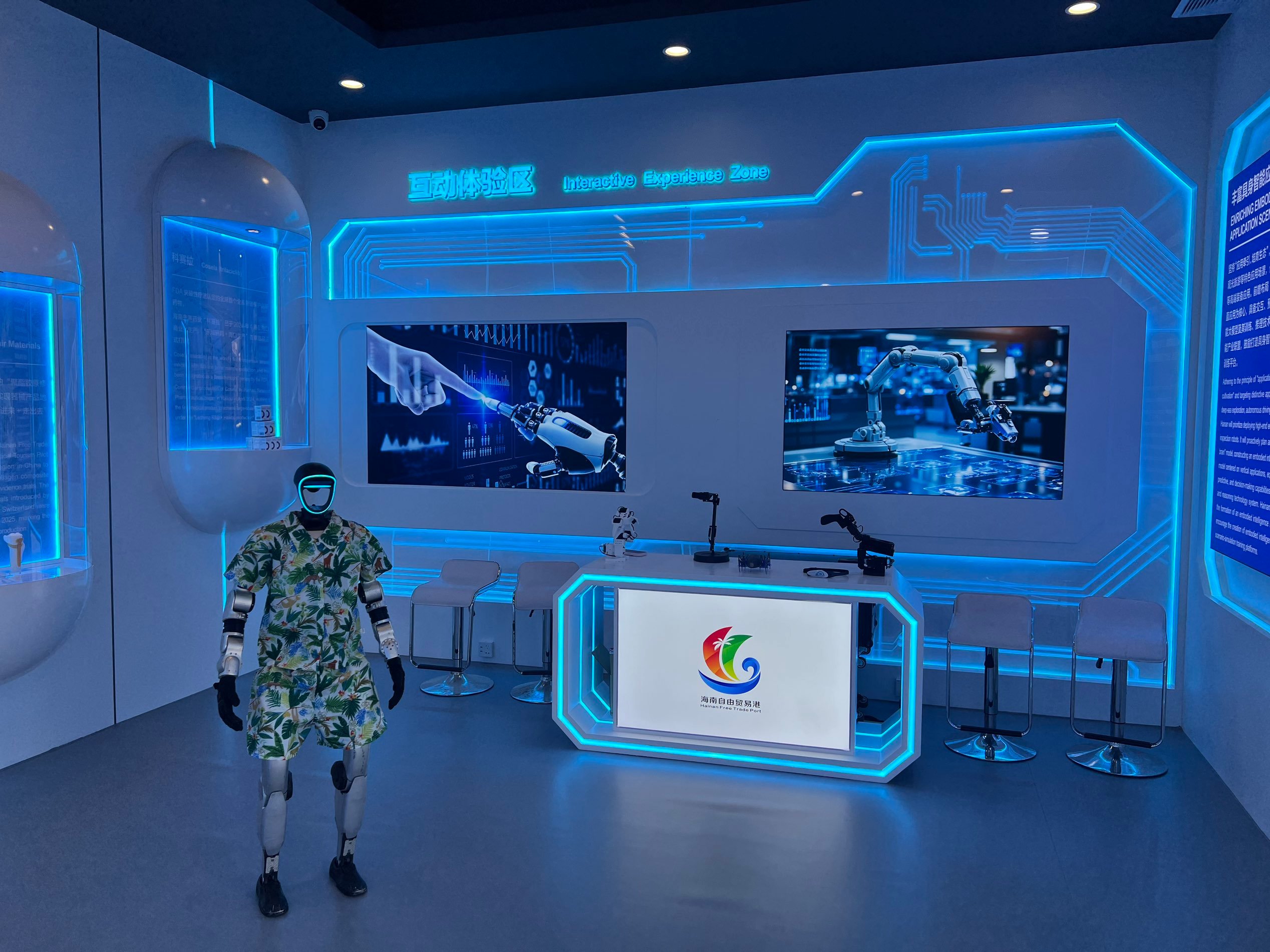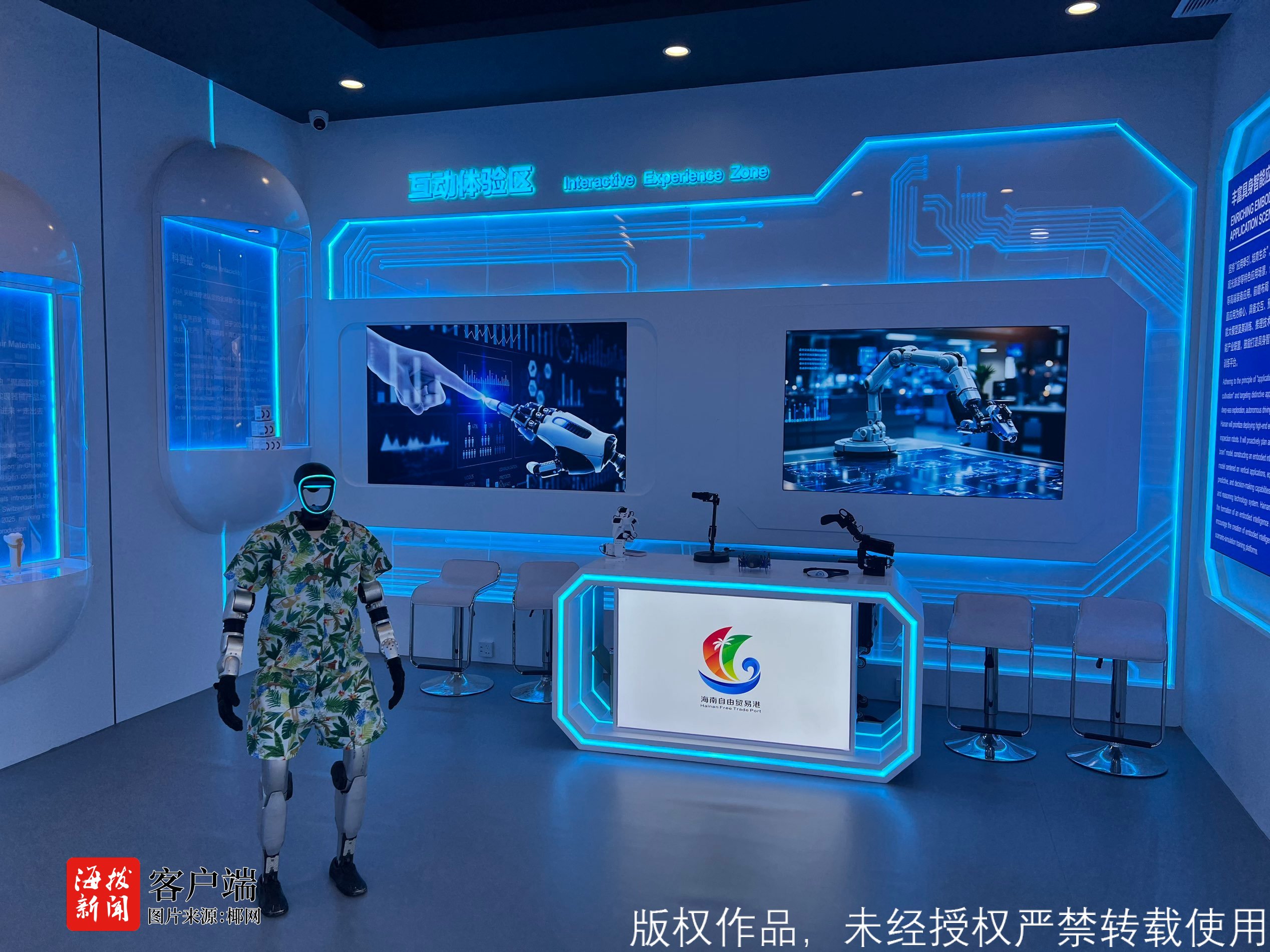主题展现场设置了诸多趣味十足的互动体验环节,打造科技与人文交融的观展氛围。智能机器人讲解员全程为观众提供专业讲解服务,认知障碍VR治疗系统可供现场体验,海南大学神芯科技研发的脑机接口芯片等前沿科技产品也将集中亮相,展现海南科技创新的硬核实力。值得关注的是,主题展特别打造海南文化空间,深度彰显海南本土文化底蕴。观众在此可欣赏独具特色的海南黎锦民间文艺版权作品,近距离感受非遗文化的传承与创新;还能品尝海南热带雨林特色好物,沉浸式体验海南的自然与人文风情。
