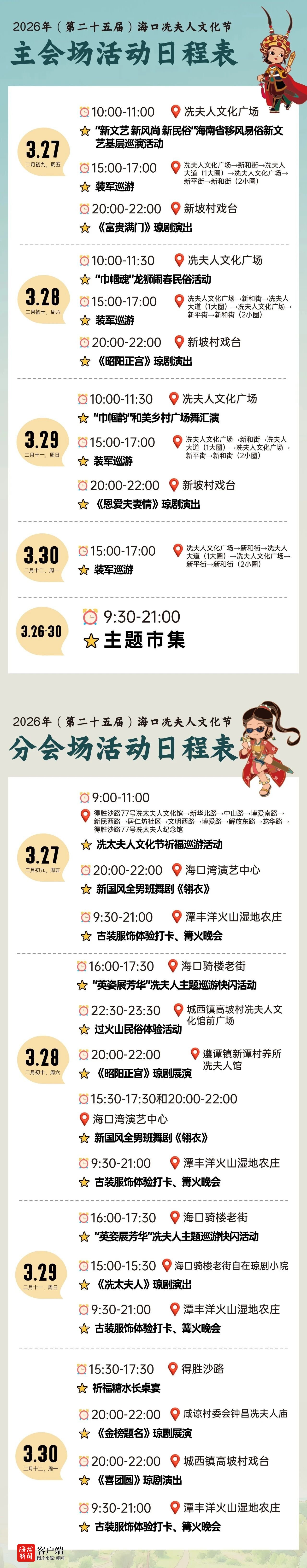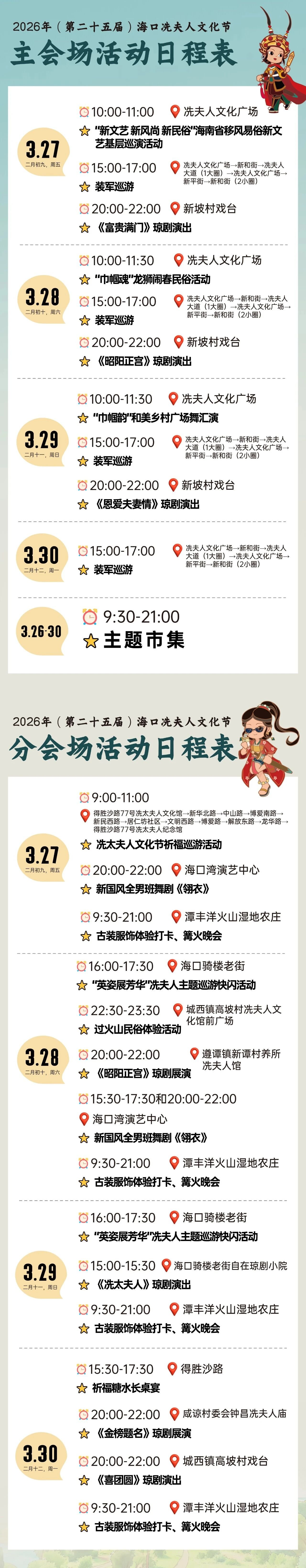 据了解,本届文化节以“保护运用传承民俗文化 打造魅力海岛人文之城”为主题,以新坡镇冼夫人文化广场为主会场,城西镇、遵谭镇、中山街道(骑楼老街)、潭丰洋湿地共享农庄、海口湾演艺中心为分会场,将举办“新文艺 新风尚 新民俗”海南省移风易俗新文艺基层巡演、“巾帼魂”龙狮武术民俗专场以及“巾帼韵”和美乡村广场舞展演等一系列群众参与度高的文化活动,让市民游客在观礼之余,亲身感受民俗文化的活力。