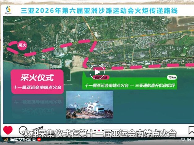 第六届亚洲沙滩运动会(以下简称“三亚亚沙会”)火炬传递活动将于3月30日正式在三亚举行,本次活动以“传递友谊 相约三亚”为主题,将沿着一条融合自然风光与人文底蕴的路线传递,以火炬圣火为纽带,展现三亚的开放与包容,赓续亚洲体育的拼搏与荣光。