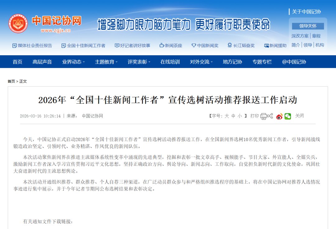 中国记协已正式启动2026年“全国十佳新闻工作者”宣传选树活动推荐报送工作,在全国新闻界选树10名优秀新闻工作者,引导新闻战线锻造政治坚定、引领时代、业务精湛、作风优良的新闻队伍。