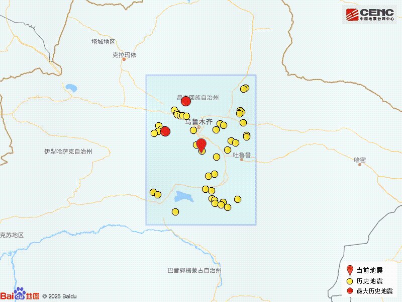 历史地震:根据中国地震台网速报目录,震中周边200公里内近5年来发生3级以上地震共75次,最大地震分别是2026年3月7日在新疆昌吉州呼图壁县发生的4.8级地震(距离本次震中117公里)和2022年7月20日在新疆昌吉州昌吉市发生的4.8级地震(距离本次震中146公里),按震级大小前50次历史地震分布如图。