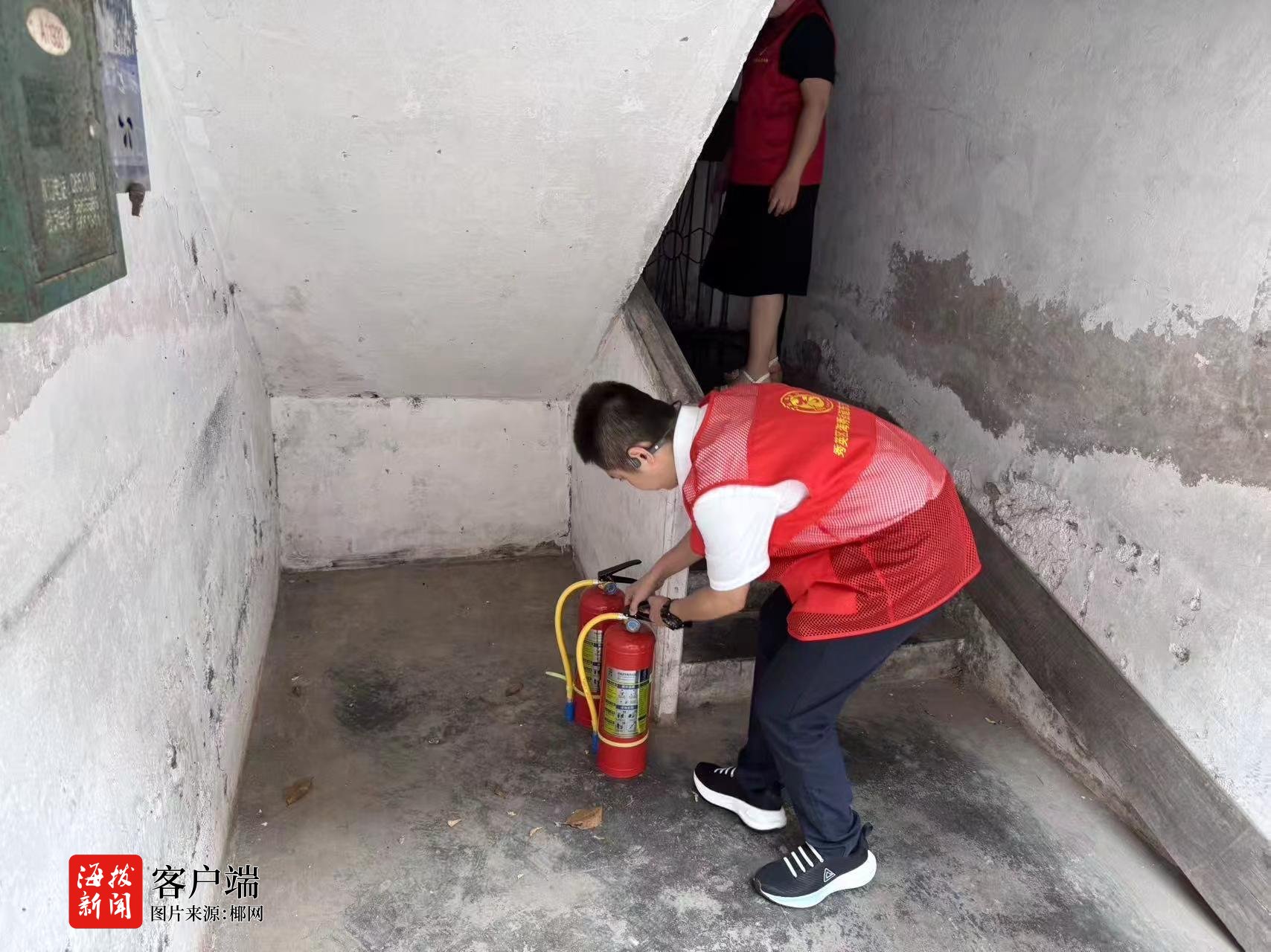 “阿姨,灭火器放在一楼楼梯转角处了,这是使用说明卡片,拔掉这个保险销,对准火源根部按压就行。”在东方洋社区的多个“三无小区”里,海秀街道党员志愿者和东方洋社区工作人员,一边放置灭火器,一边耐心地向过往居民讲解。