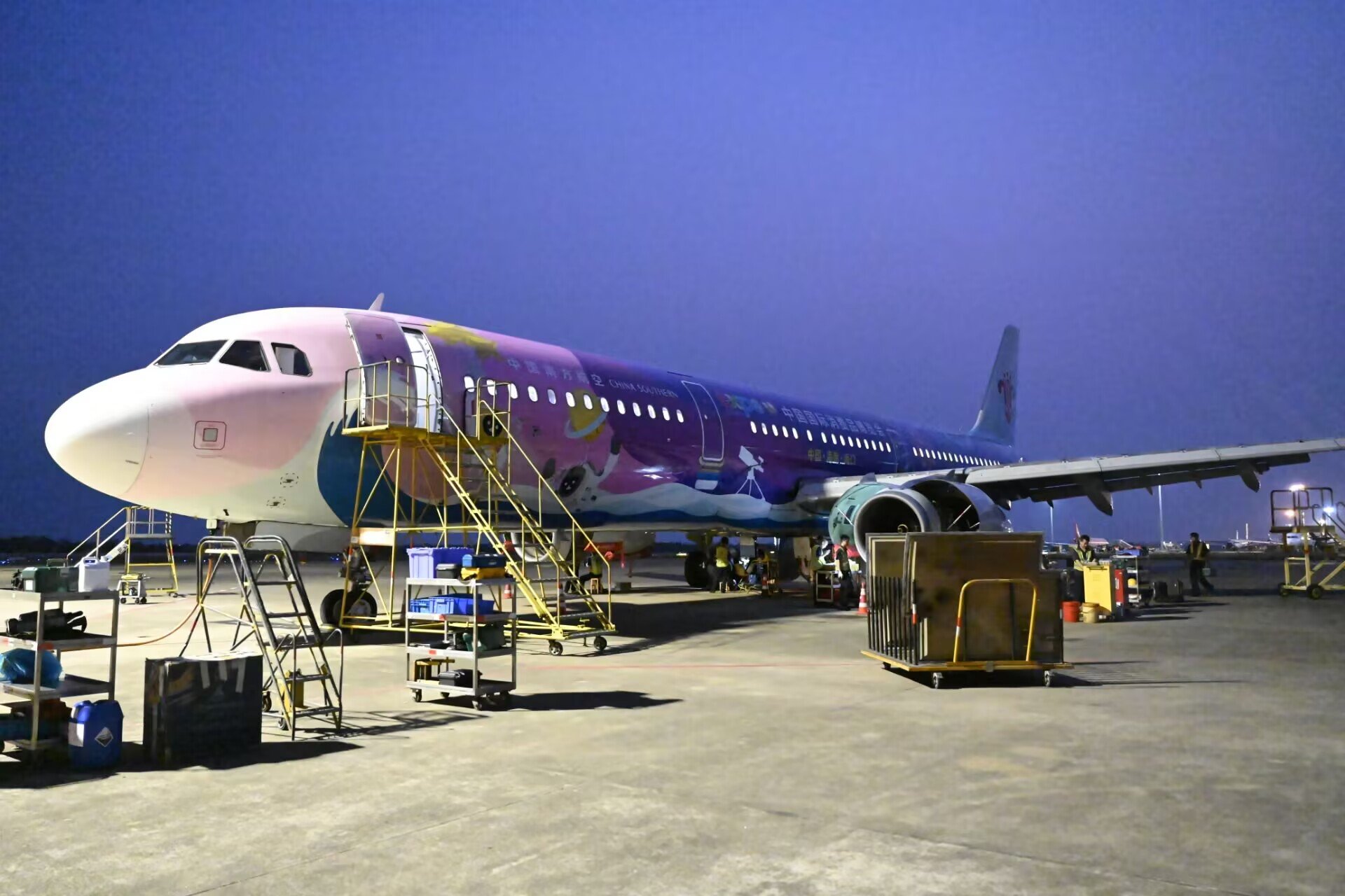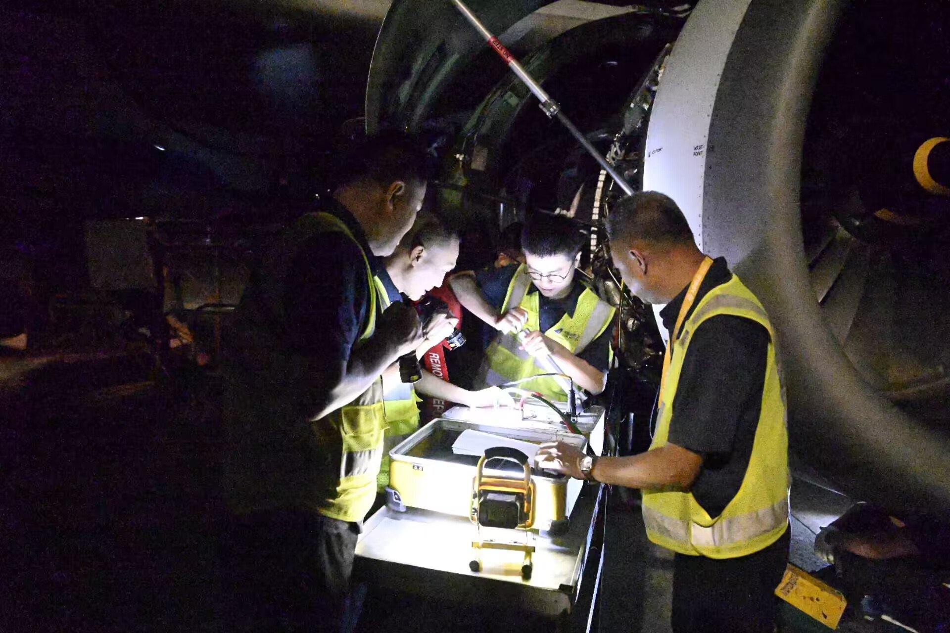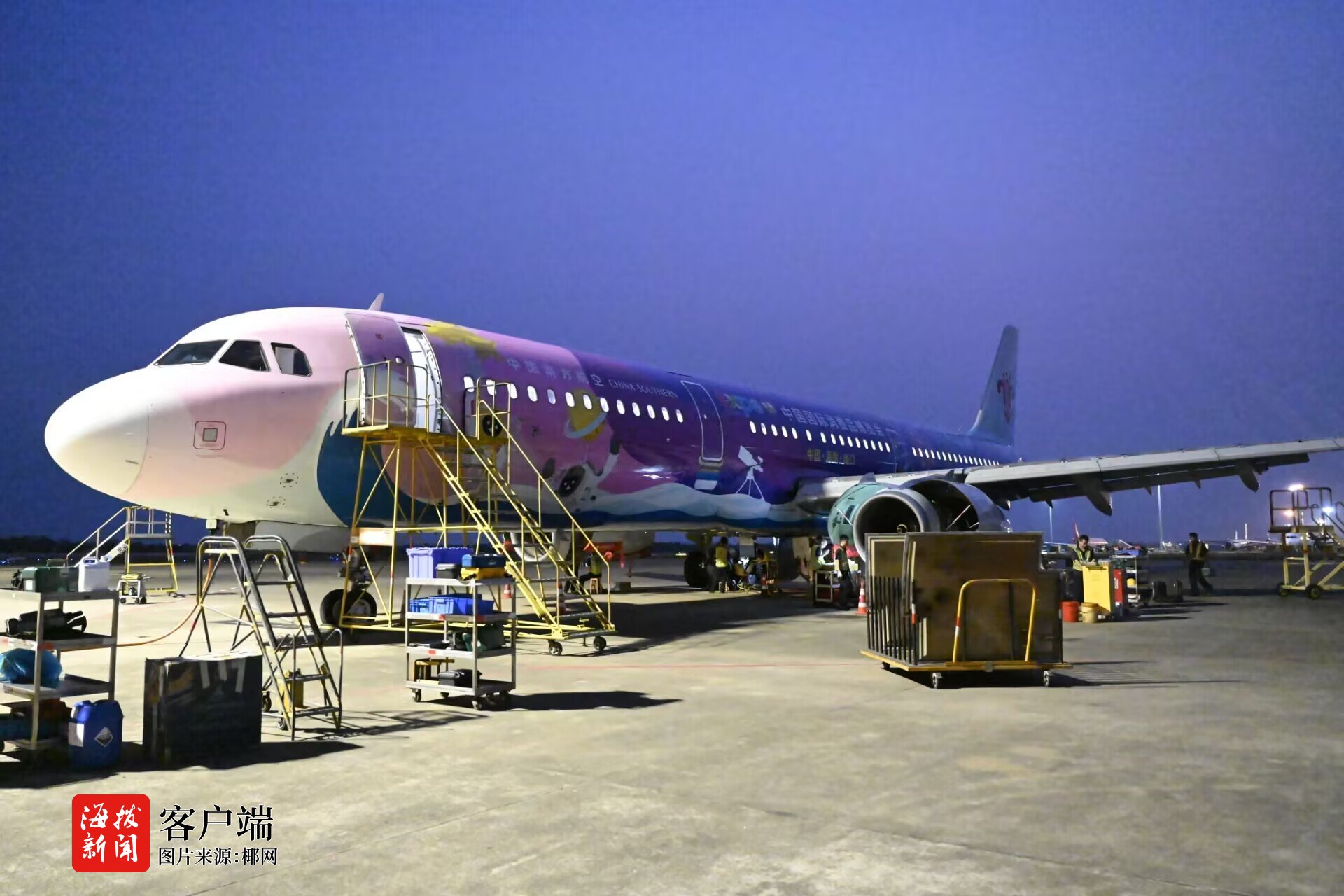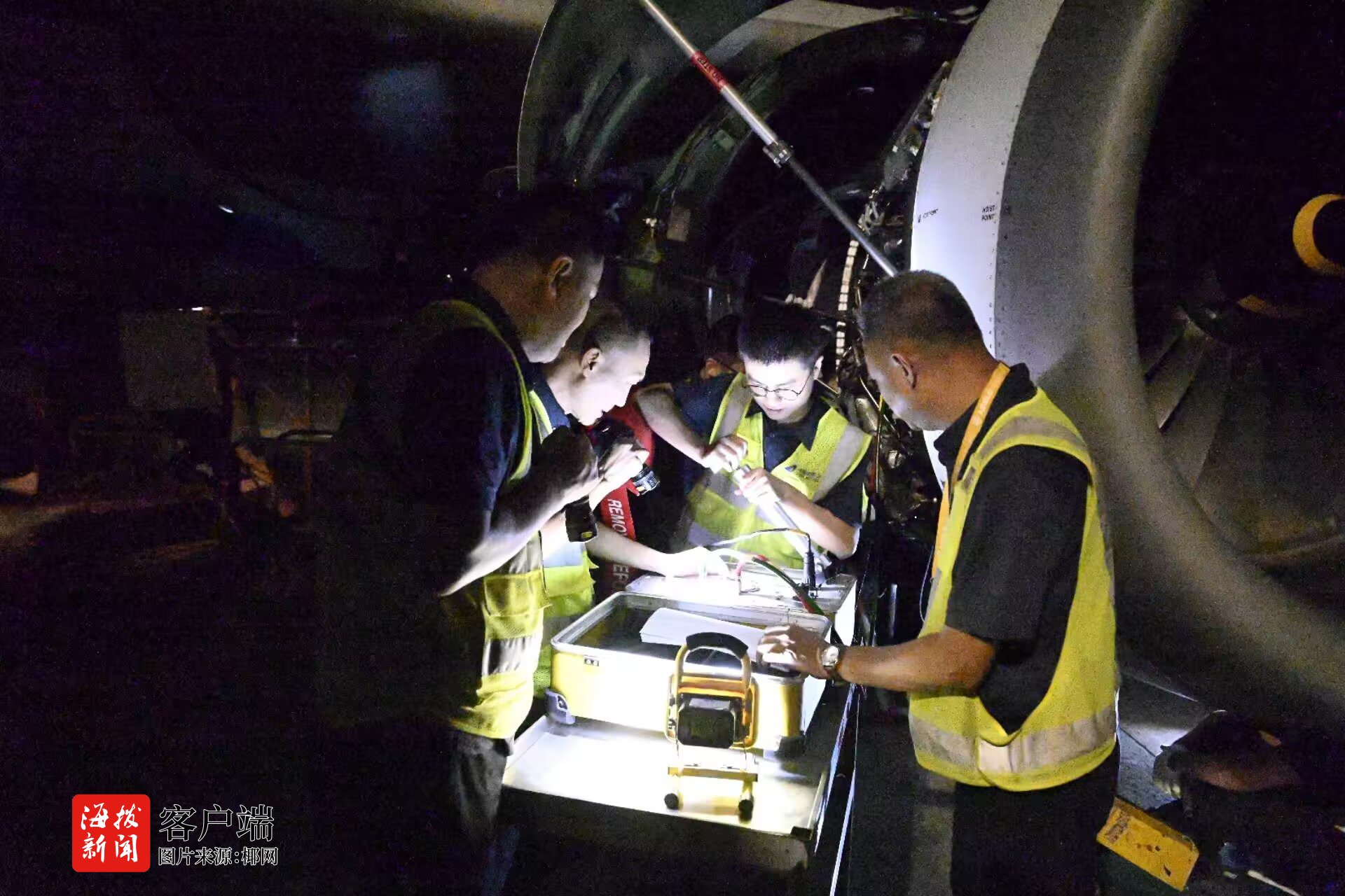 商报全媒体讯(椰网/海拔新闻记者 许文玉 通讯员 王建勇 纪巧珠 武若男 林翔宇)4月4日,海口美兰国际机场停机坪上,南航工程技术分公司机务工程师正对“消博号”飞机开展深度检查。