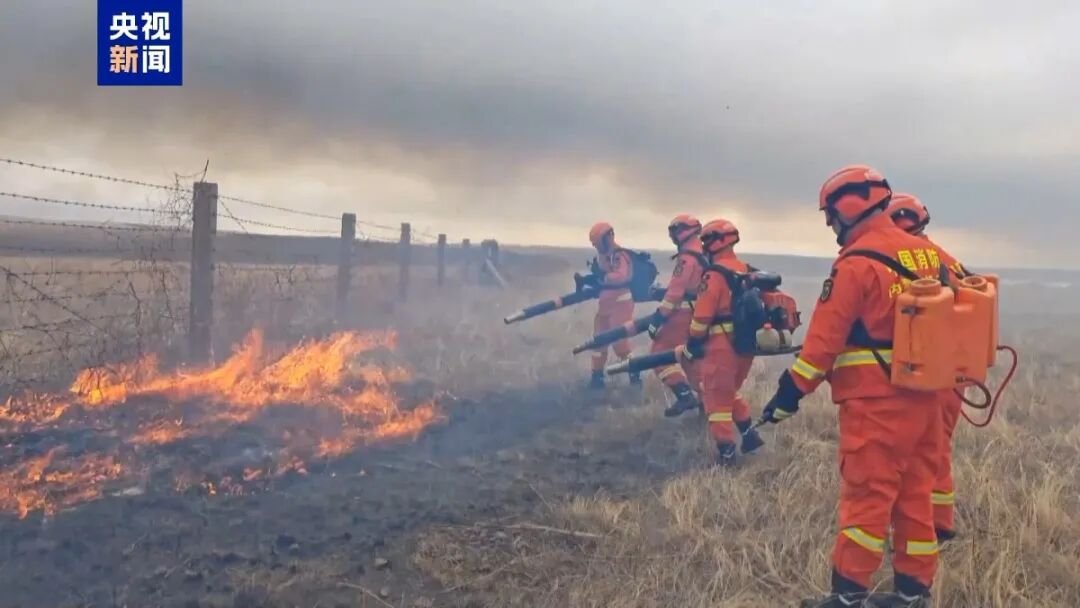 12时许,锡林郭勒消防救援机动支队指战员在1169号界桩附近,沿边境隔离网有序实施“边打边清”战术,全力阻截火势向我方纵深蔓延;同时,在1177号至1178号界桩区域部署前置力量,采取“以巡待扑”策略,严密监控火情动态。